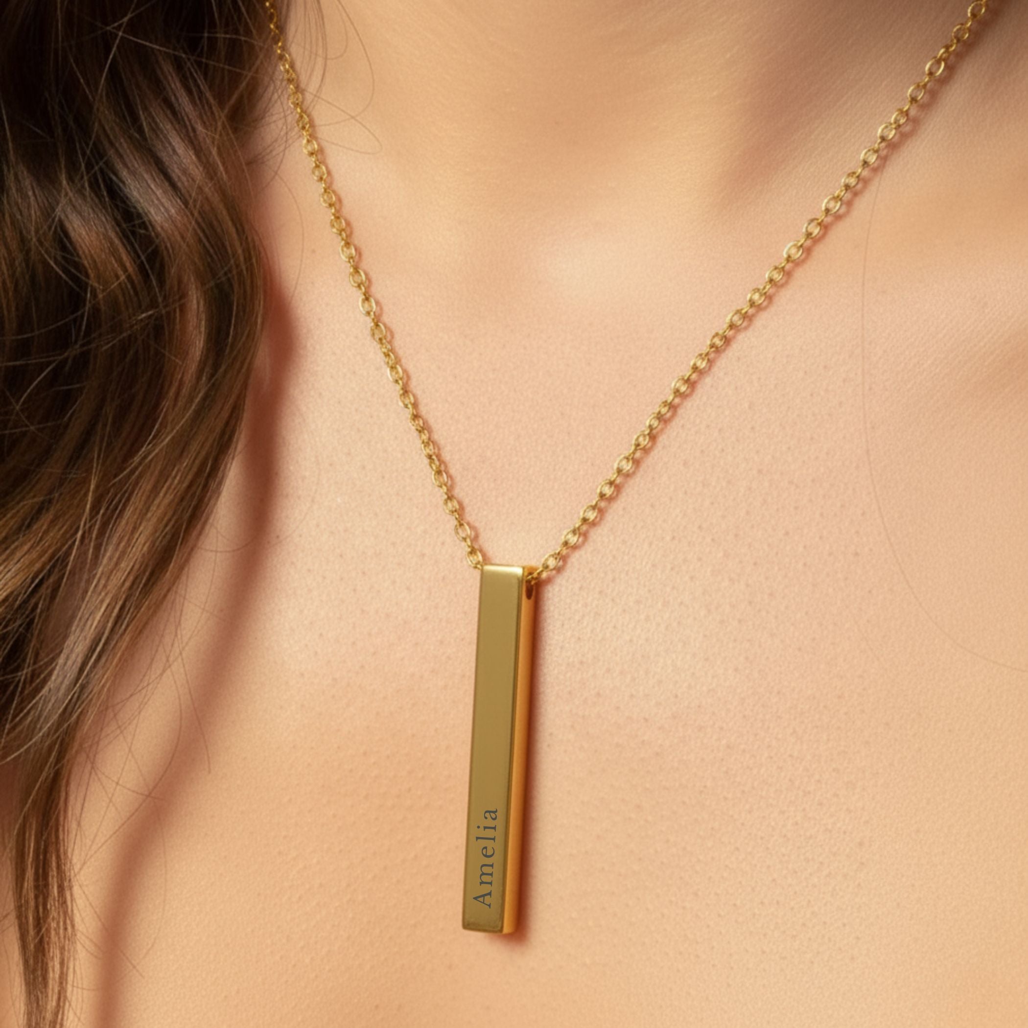 A gold engravable bar necklace that combines simplicity with sentiment — the perfect personalised gift for birthdays, anniversaries or just because.