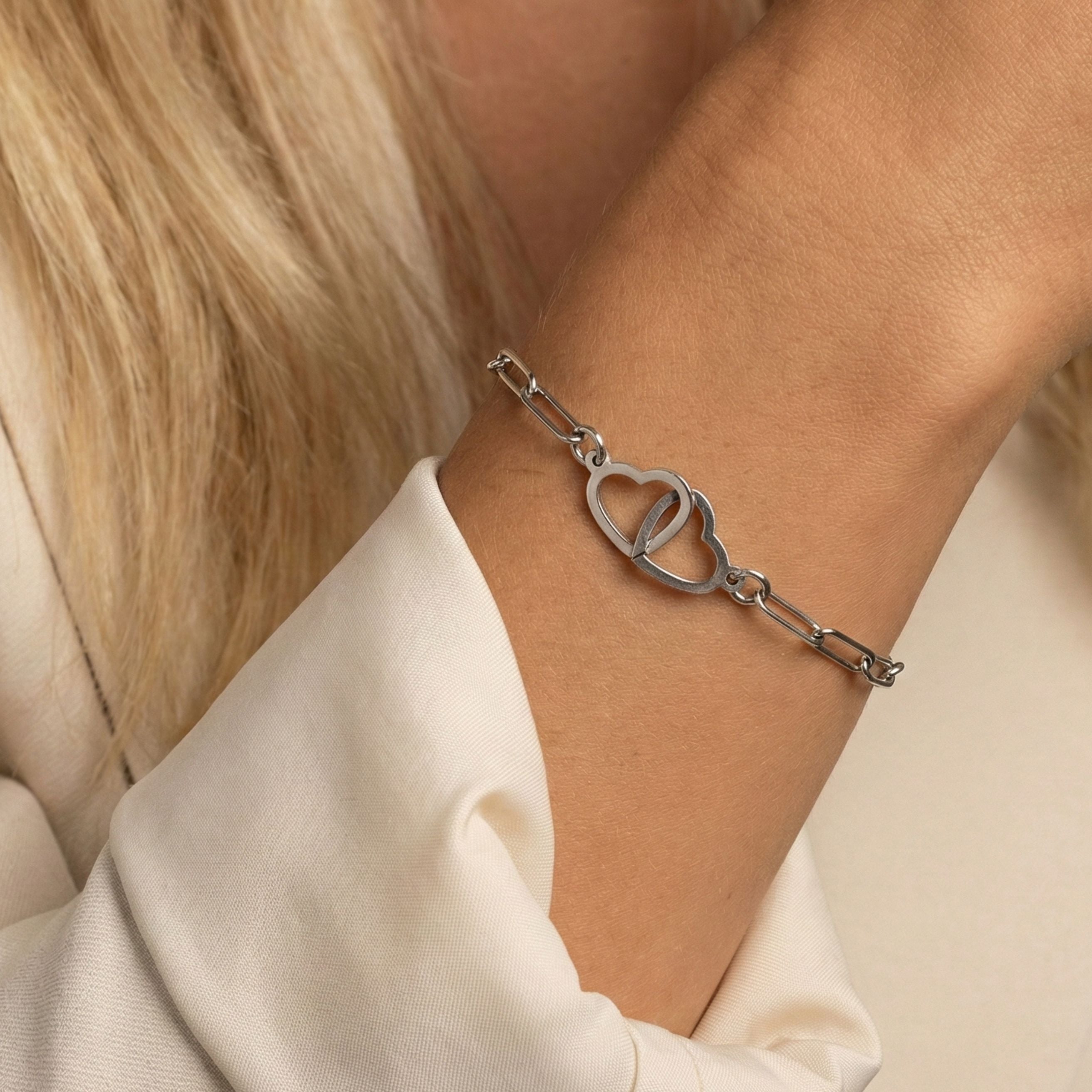 The Interlinked Heart Paperclip Bracelet in Silver features two polished hearts intertwined on a contemporary paperclip-style chain — a beautiful symbol of love, friendship or family. Crafted from premium stainless steel, it’s waterproof, durable and made to shine every day.