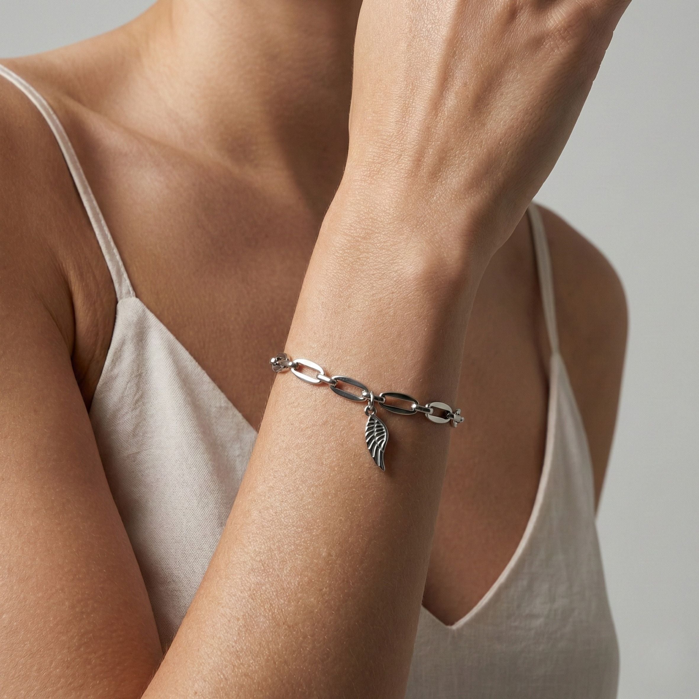 A silver angel wing bracelet that captures elegance and meaning, perfect for gifting or cherishing as a keepsake.