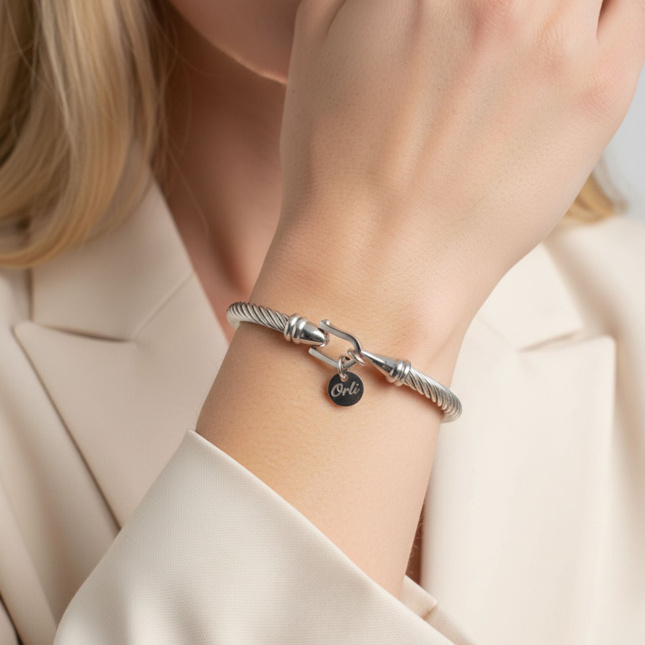 Sleek and minimal, the all-silver Twist Lock Bangle delivers a clean, modern look with its twisted cable detailing and secure hinged clasp. Designed for durability, style and daily wear.