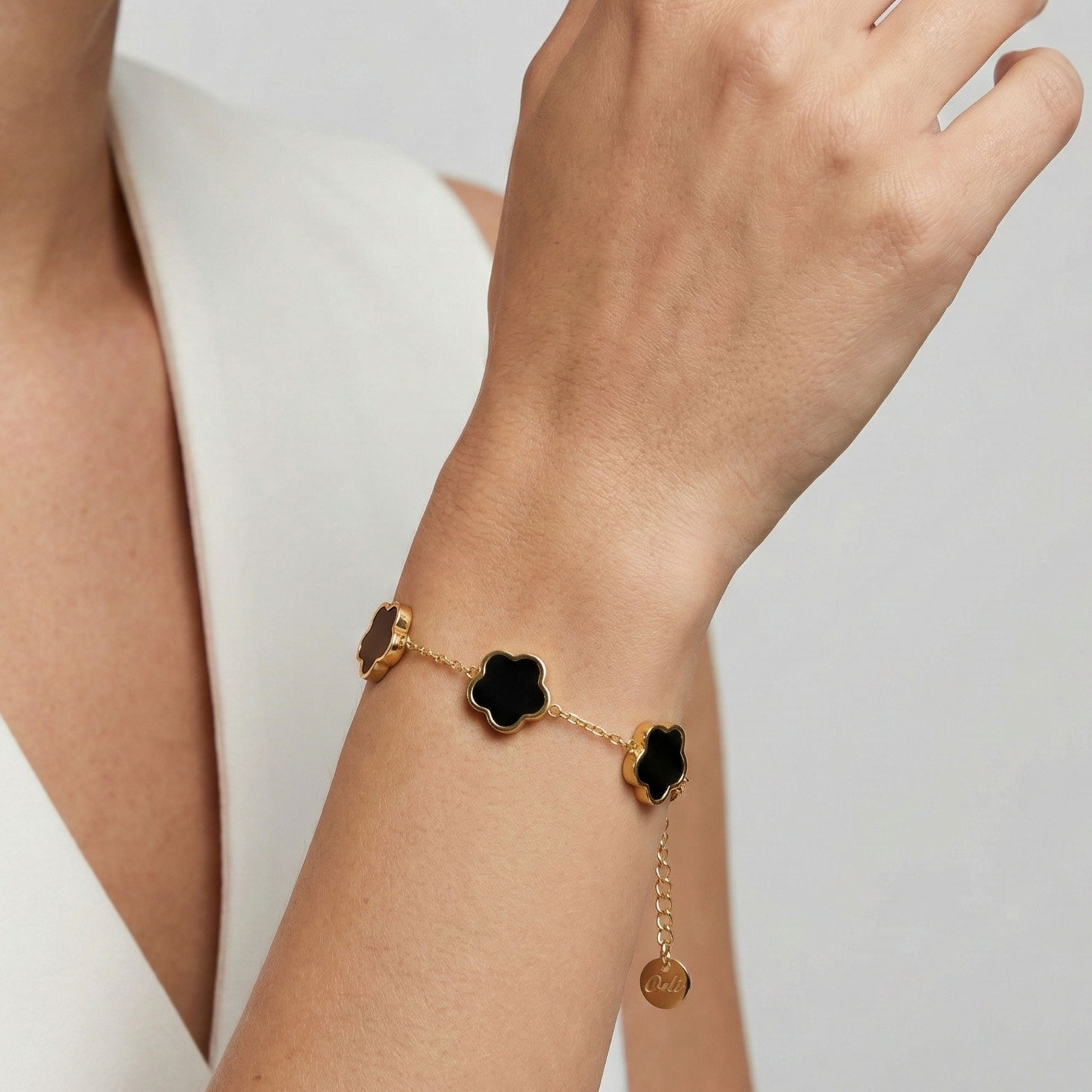 Featuring smooth black clover charms linked along a fine gold chain, this bracelet catches the light with every movement and pairs effortlessly with any outfit.