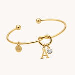 Simple, sleek, and full of meaning – this open bangle is crafted from durable stainless steel and finished with a sparkling birthstone and engraved initial charm for a personal touch.