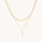 The Pearl Layered Necklace in Gold pairs modern chain links with a dainty freshwater pearl drop, creating the perfect blend of elegance and edge.
