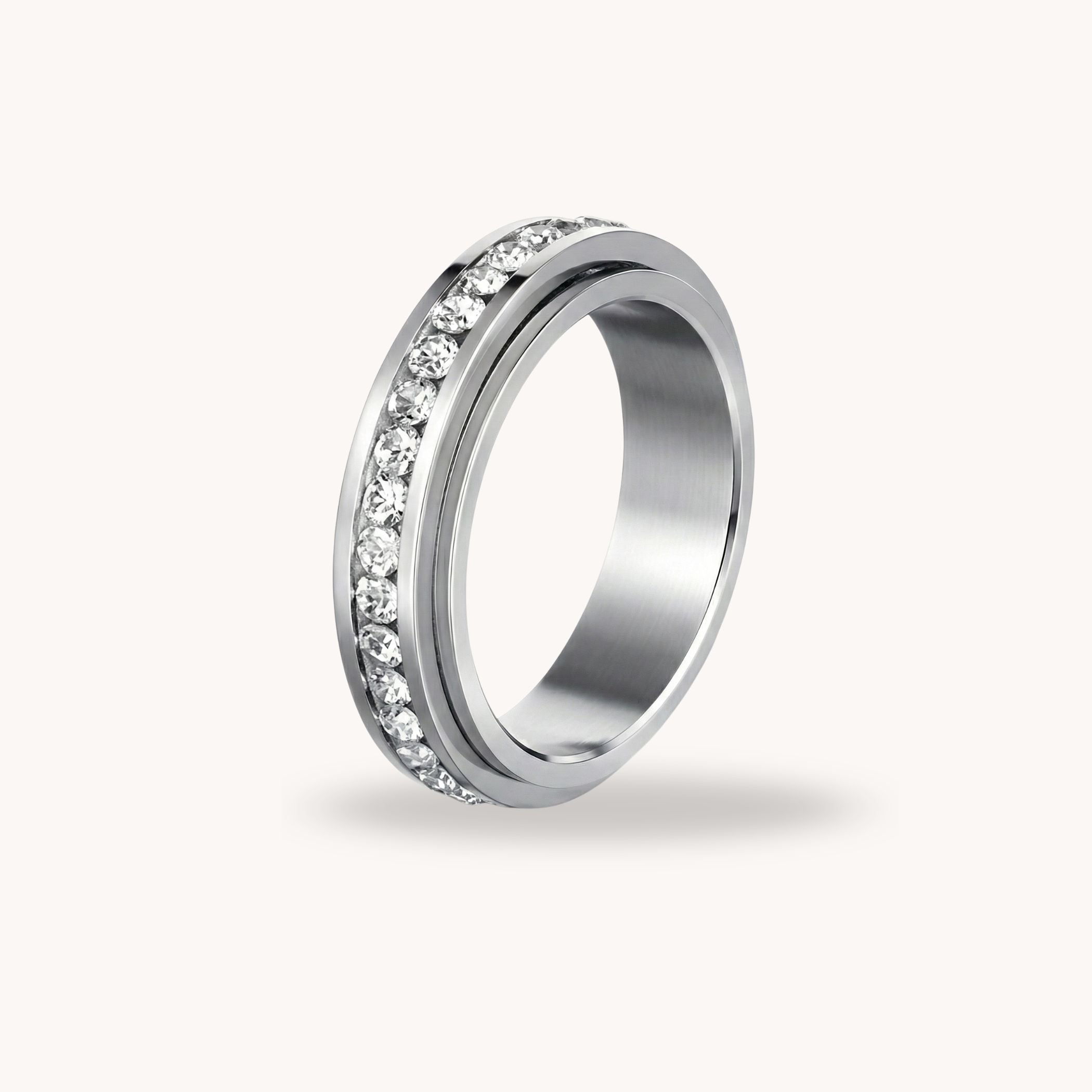 A silver spinner ring that blends soothing movement with timeless sparkle.