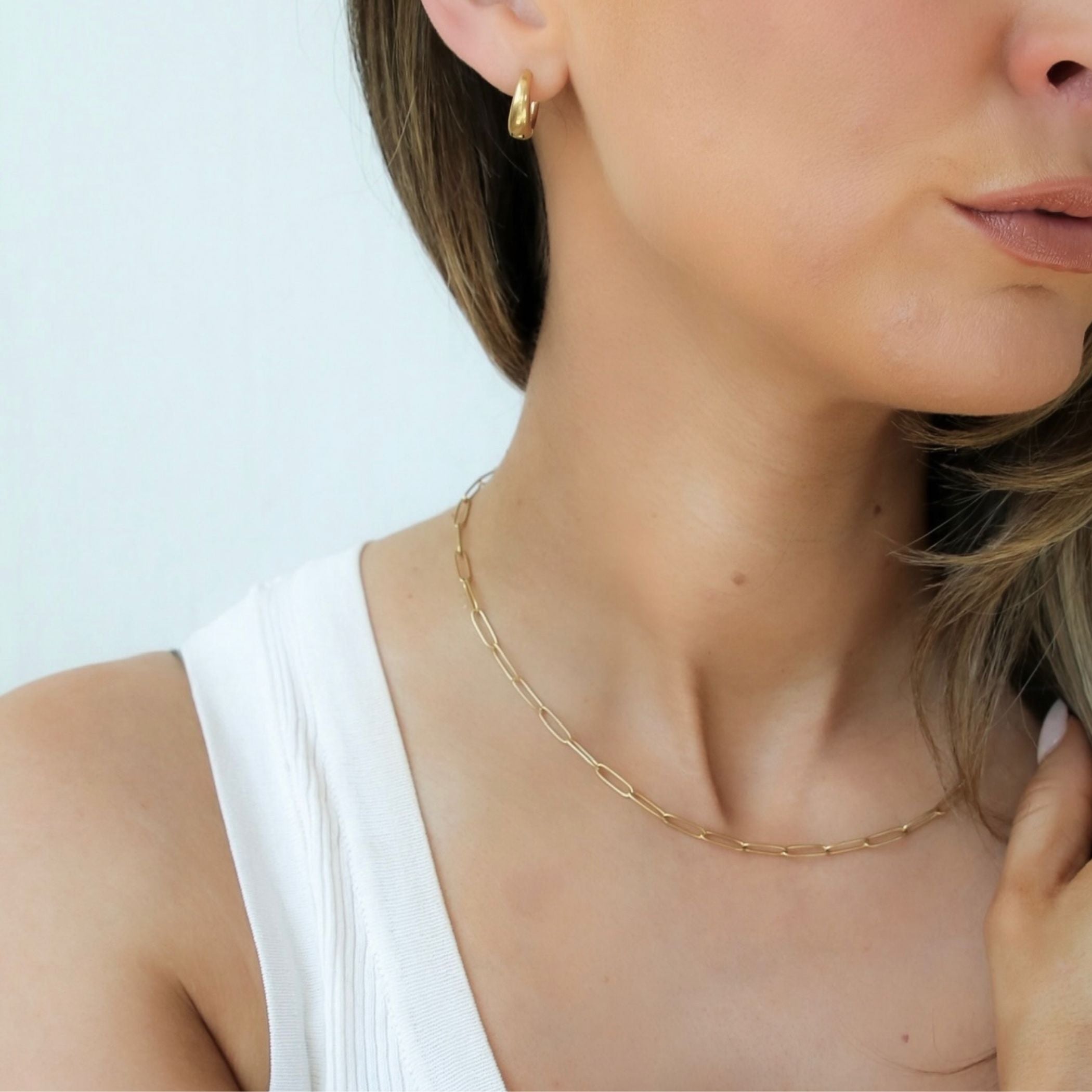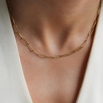 The Paperclip Chain Necklace in Gold features sleek, elongated links crafted from 18K gold plated stainless steel for a radiant, waterproof finish.