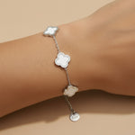 Featuring smooth white clover charms linked along a fine silver chain, this bracelet catches the light with every movement and pairs effortlessly with any outfit.