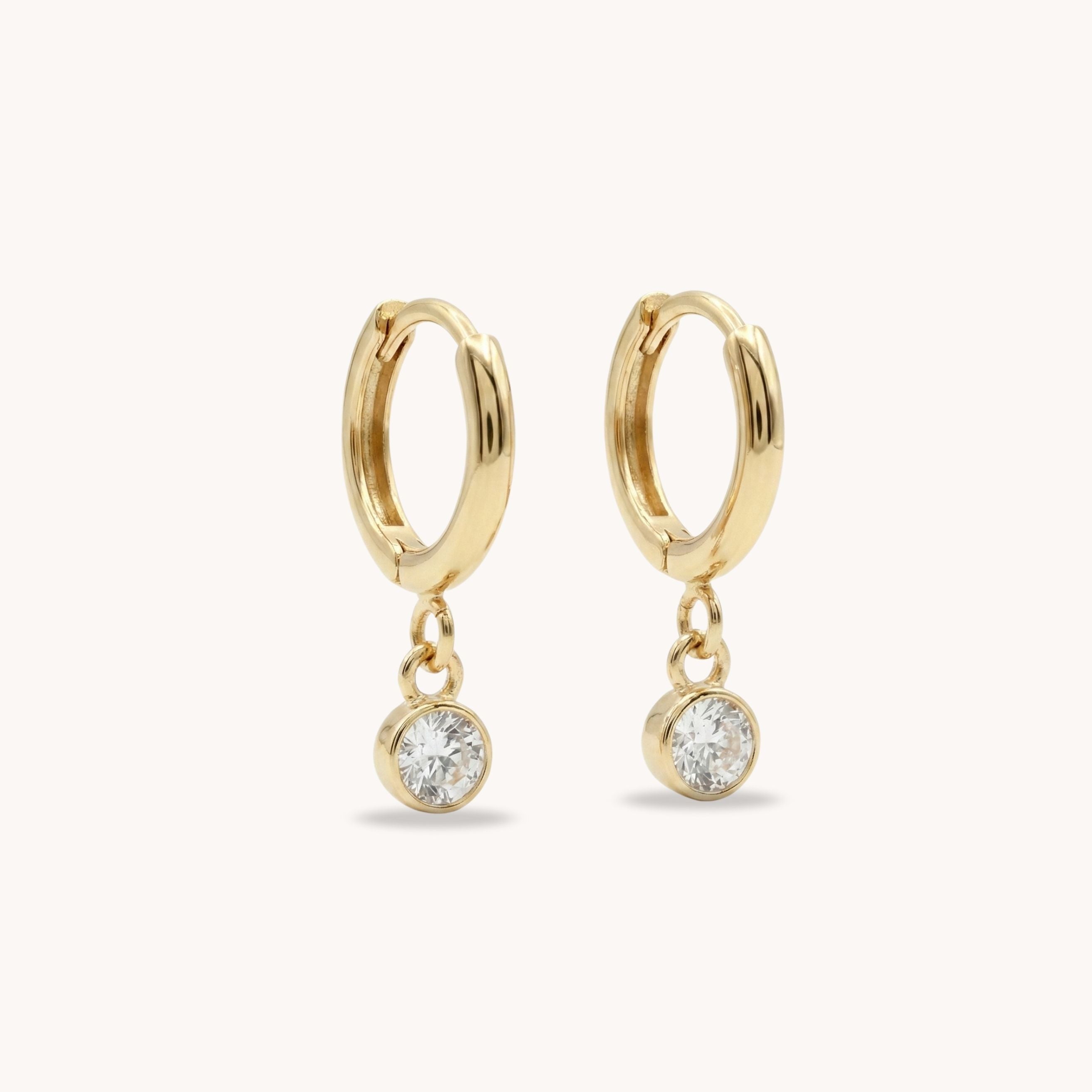 Design: 14mm smooth huggie hoops with a bezel set round birthstone charm that gently dangles for subtle movement and shine