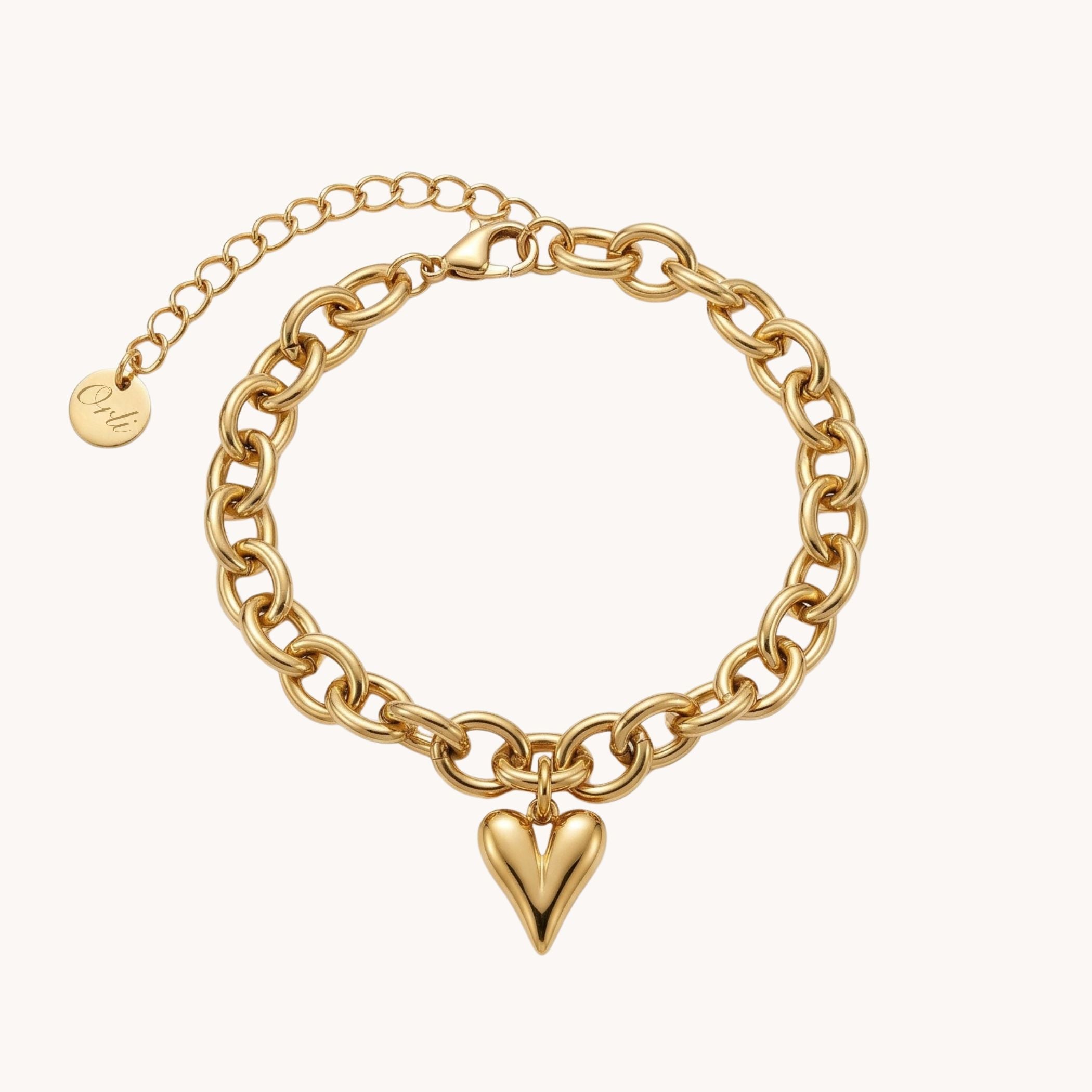 The Celine Heart Chunky Bracelet in Gold features a chunky chain with a puffed heart charm for the perfect mix of edge and sentiment. Crafted from 18K gold plated stainless steel, it’s waterproof, tarnish-free and built to last.