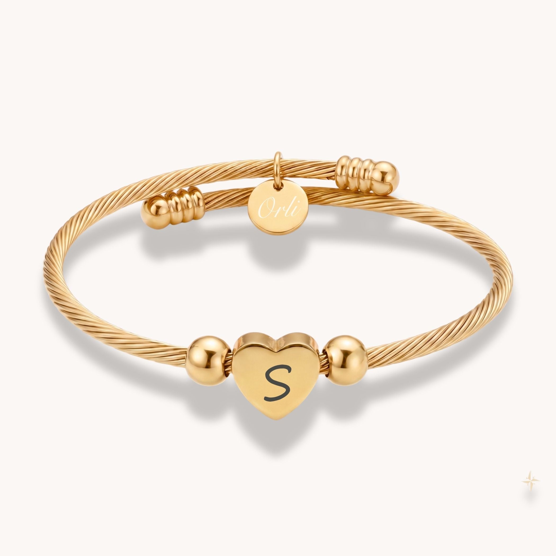 A modern take on sentimental jewellery, this elegant bangle features a polished heart centre engraved with one initial of your choice. The twisted band adds subtle texture, creating a piece that feels both personal and effortlessly refined.