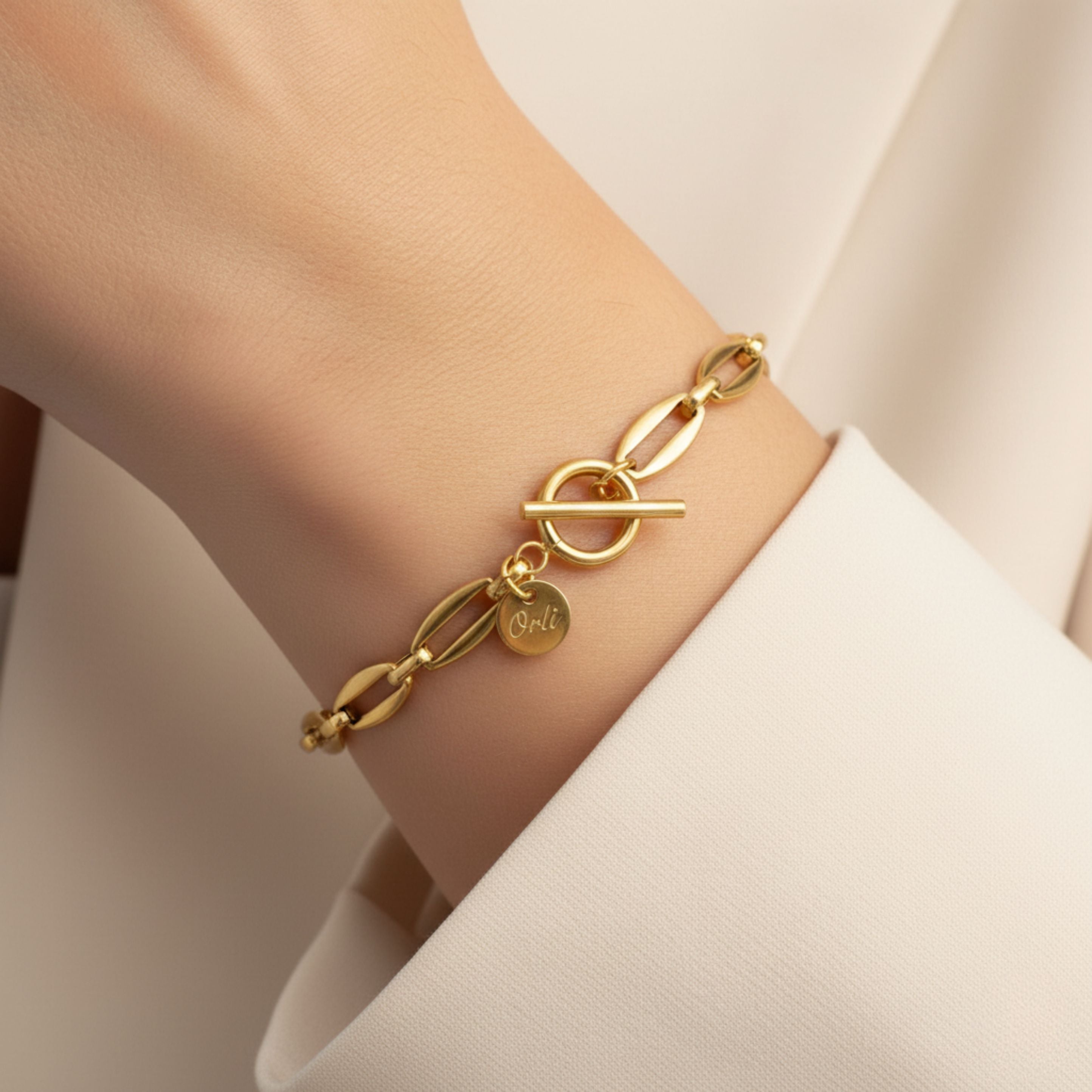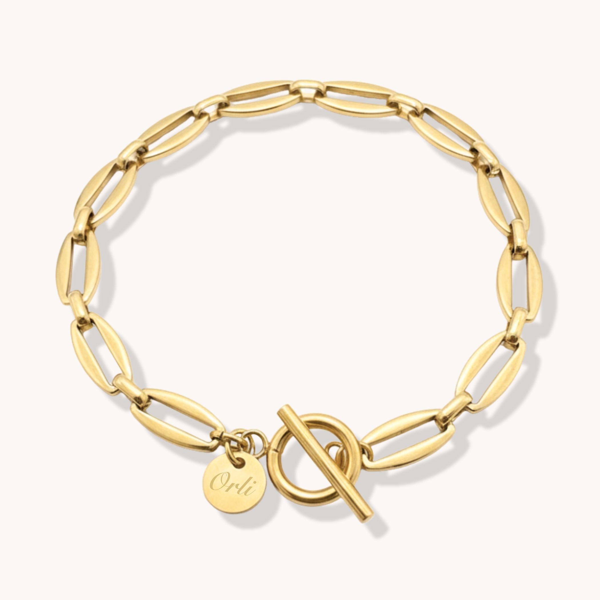 The Long Link T-Bar Bracelet in Gold features a modern long-link chain with a polished T-bar clasp — a timeless design that pairs perfectly with any outfit. Crafted from 18K gold plated stainless steel, it’s waterproof, durable and designed for everyday wear.