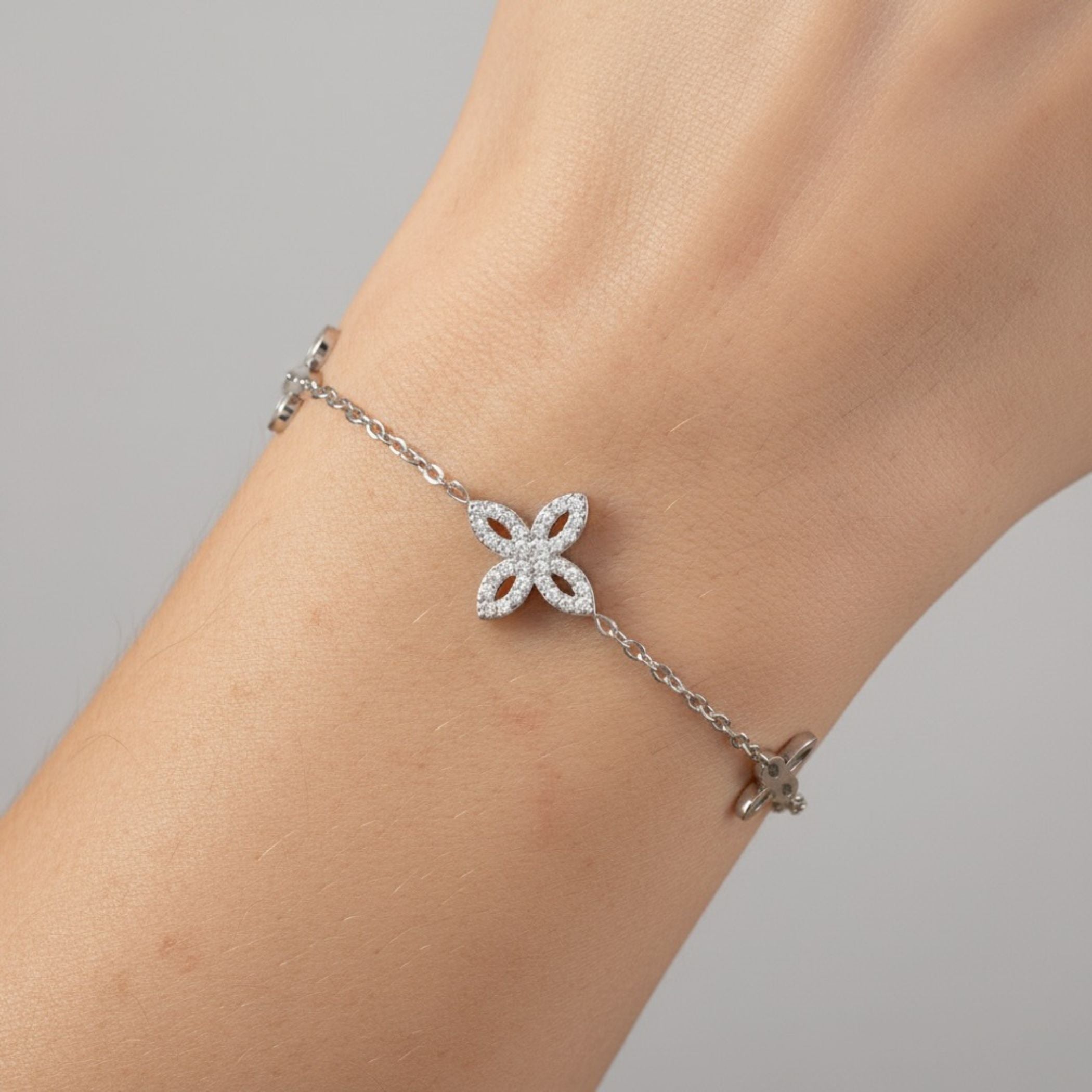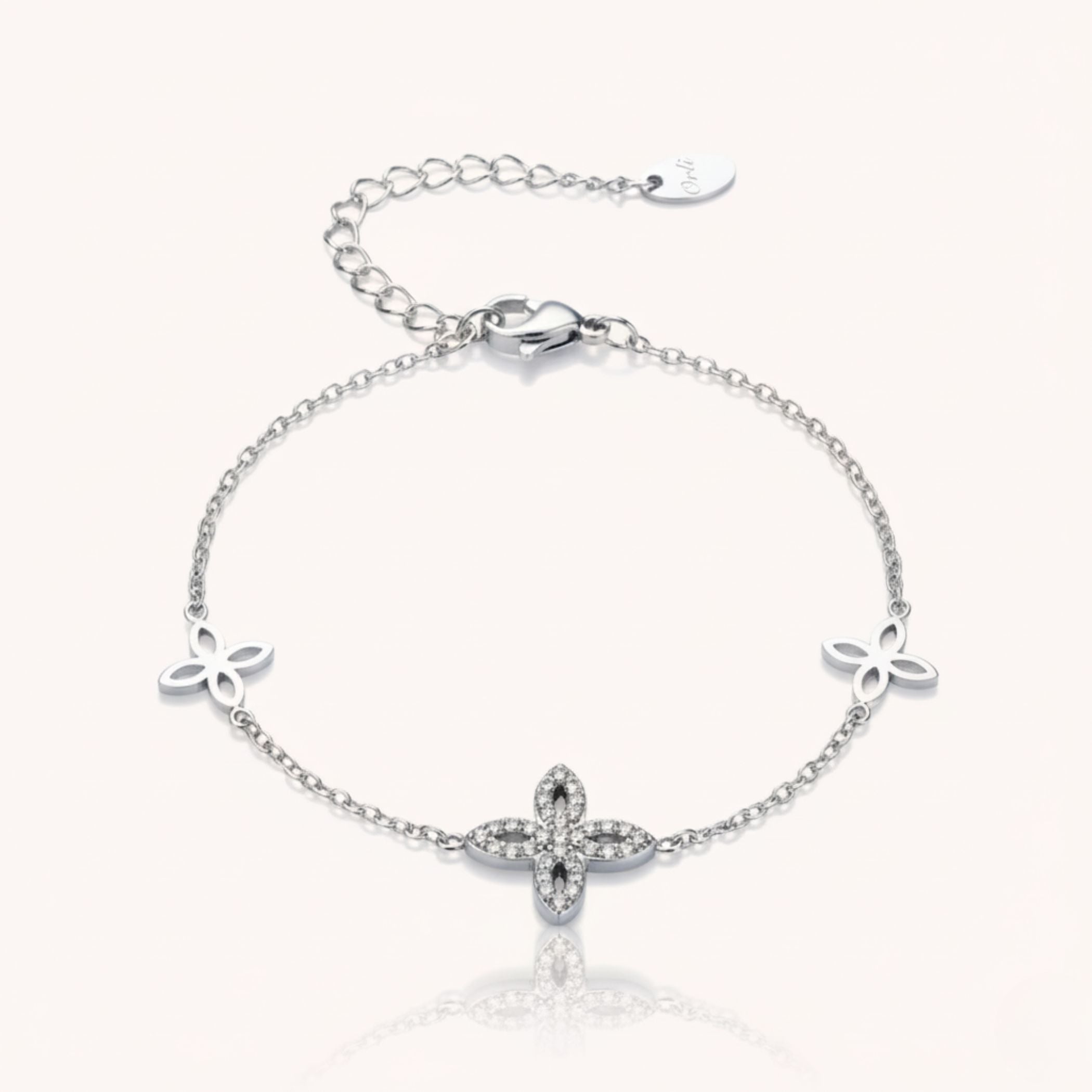 Delicate and meaningful, the Clover Bloom Bracelet celebrates new beginnings with a central petal-shaped clover accented by cubic zirconia crystals. Understated, graceful, and full of shine.