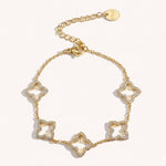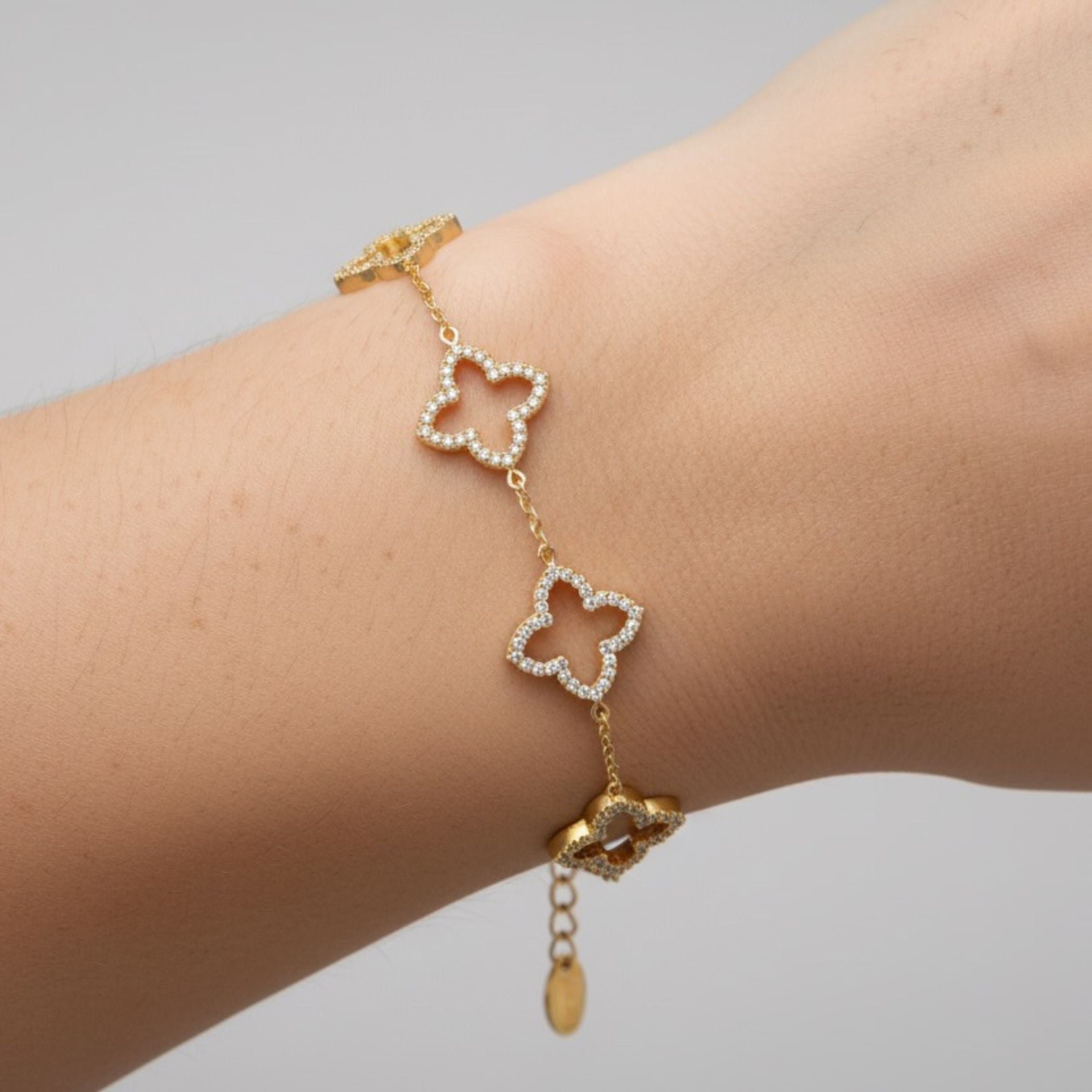 The Multi Crystal Clover Bracelet radiates light with its sequence of clover-shaped charms, each outlined in cubic zirconia for a dazzling finish. A modern lucky charm that catches the eye from every angle.