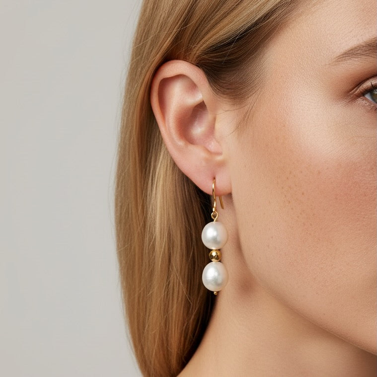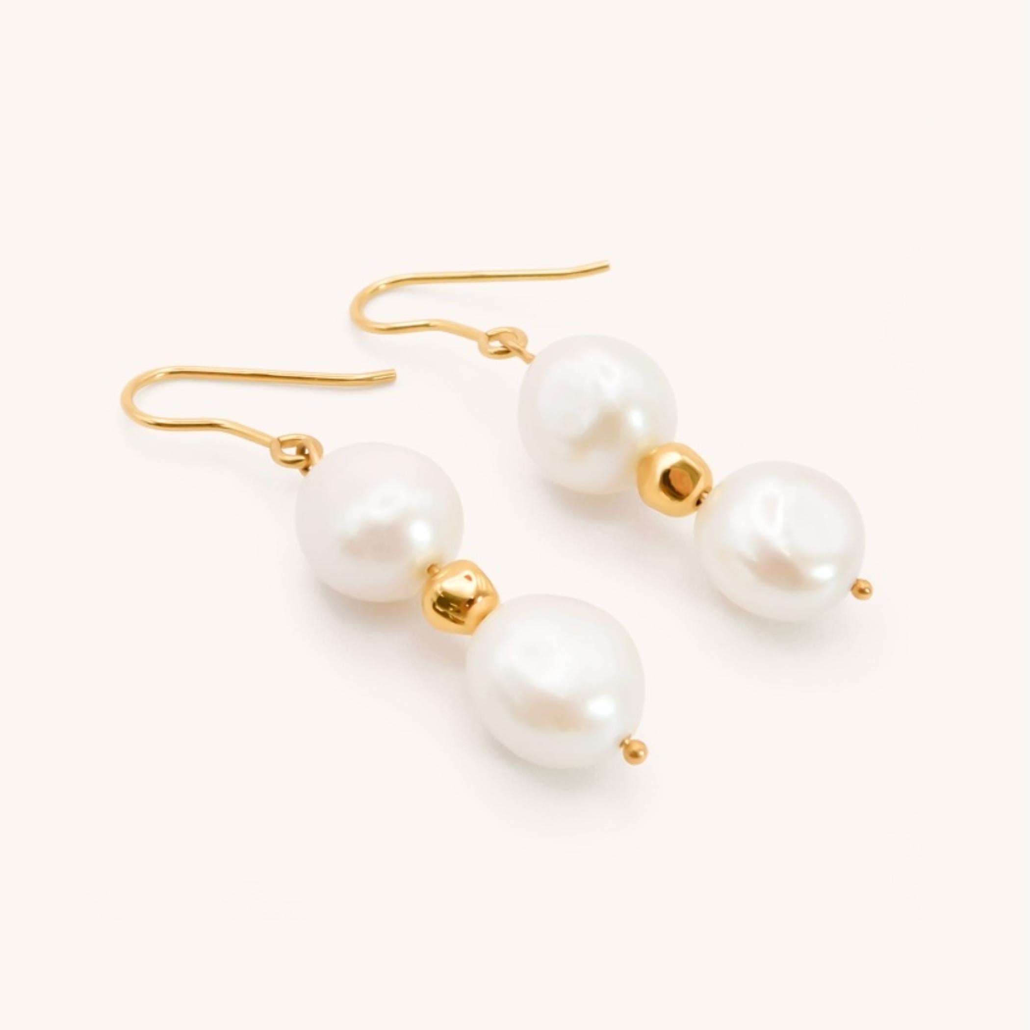 Indulge in luxury with our Sterling Silver Gloria Pearl Hook Earrings. These elegant earrings feature two large round pearls and a delicate gold irregular bead in the middle, creating a stunning and unique look. Let the lustrous pearls and silver hook design elevate your style and make a bold statement.