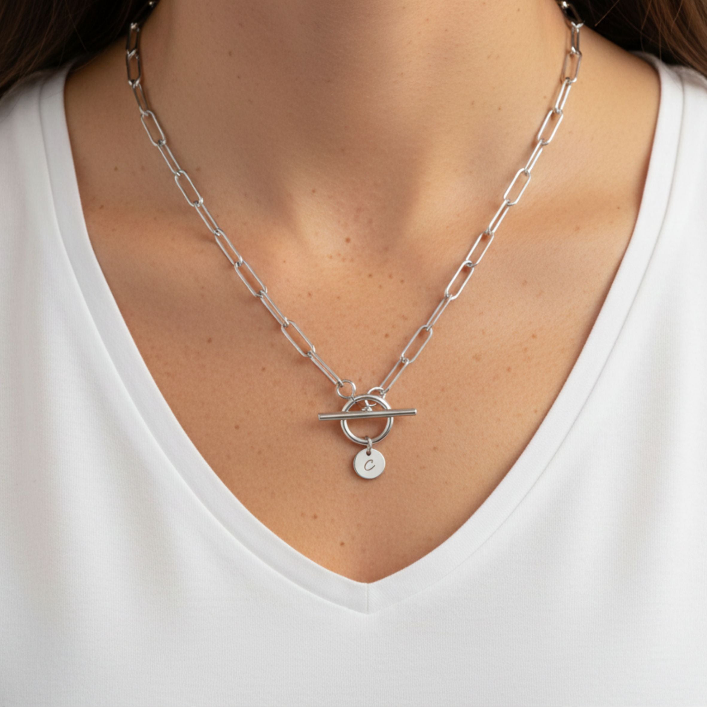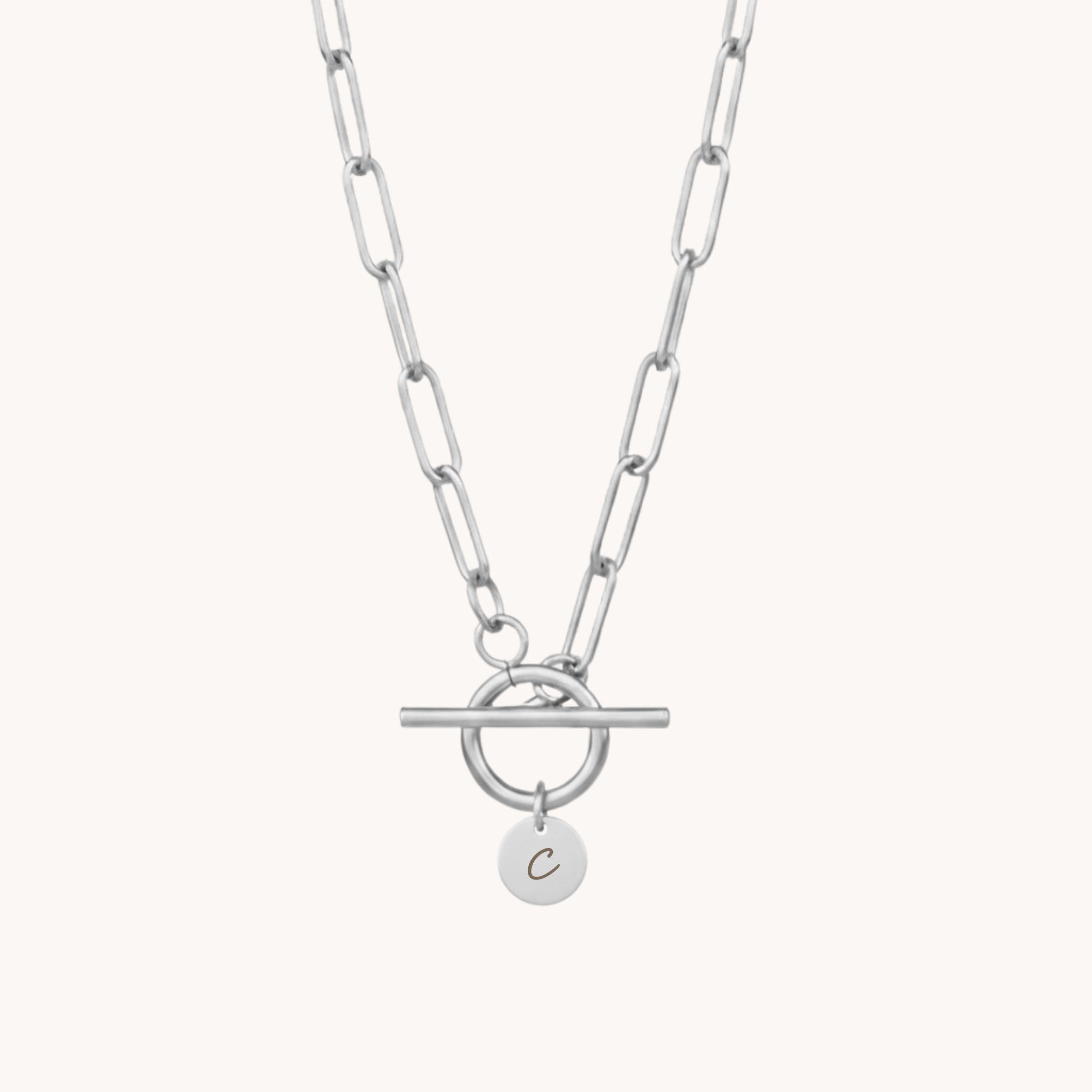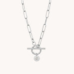 The Ella T-Bar Necklace in Silver is an everyday essential featuring a sleek paperclip chain, a trending T-bar clasp and a small engravable disc charm.