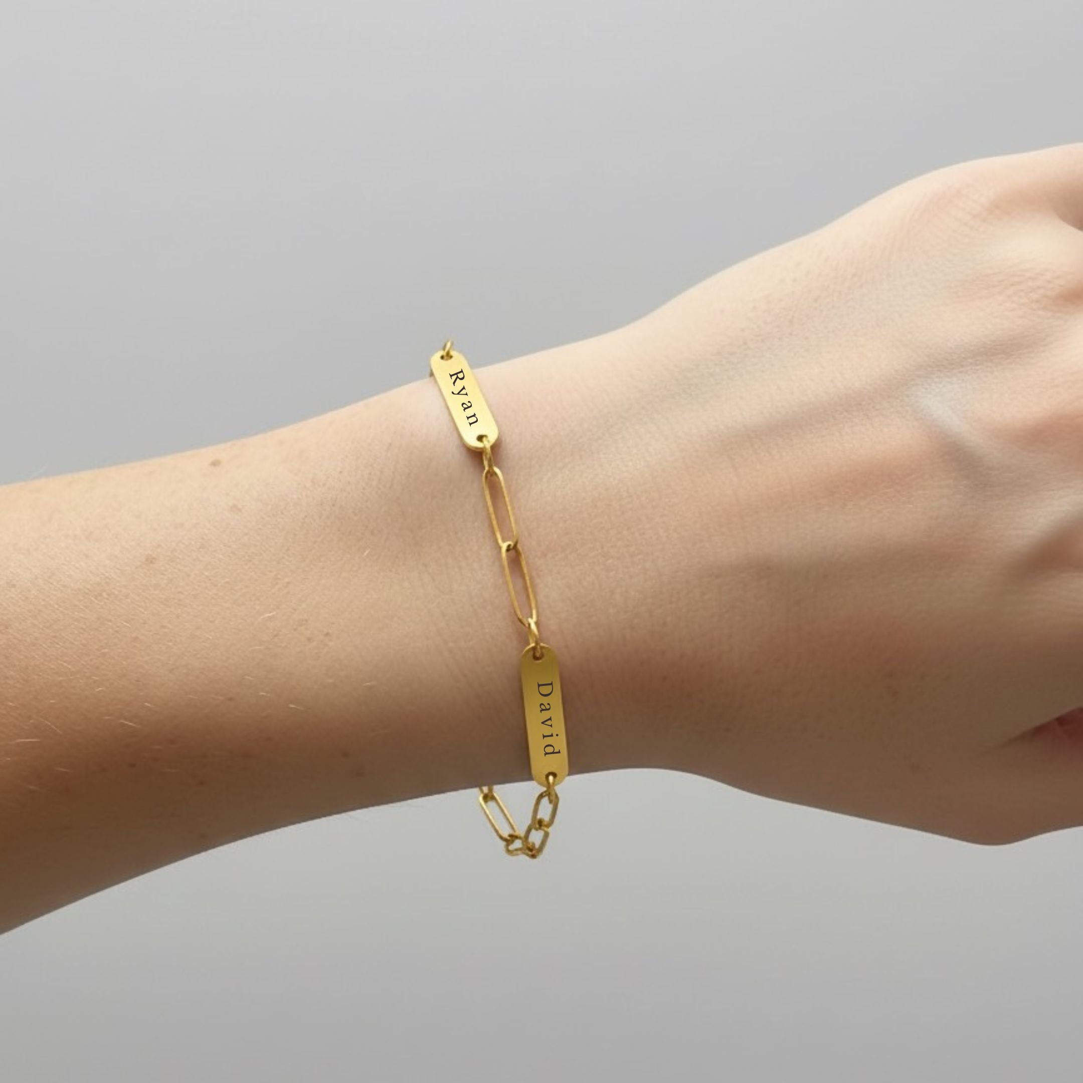 A personalised paperclip-chain bracelet with three sleek name bars that sit neatly around the wrist for a refined, meaningful finish.