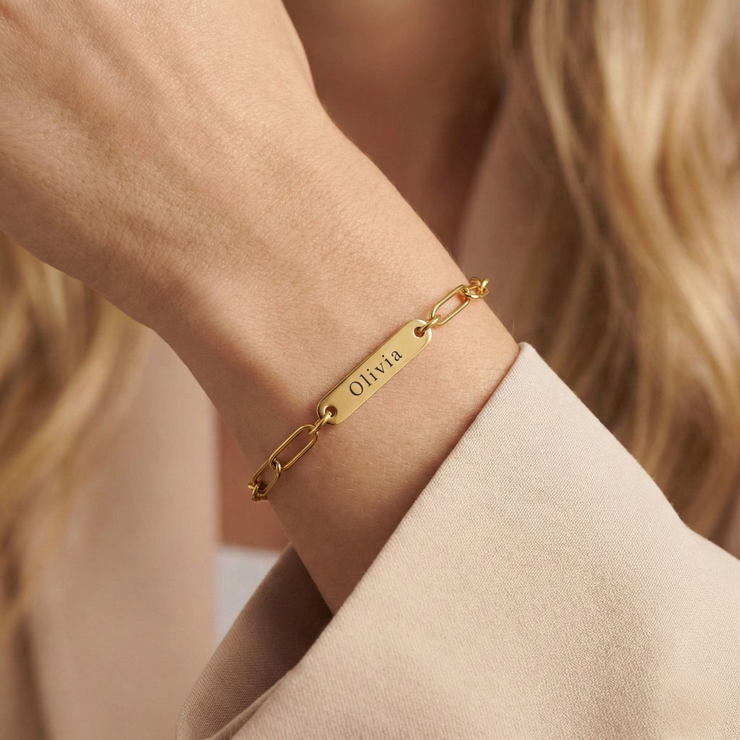 The Paperclip Chain Double Name Bracelet in Gold features a delicate paperclip chain with two engraved name bars — perfect for celebrating couples, friends or special moments. Elegant, timeless and made for everyday wear.