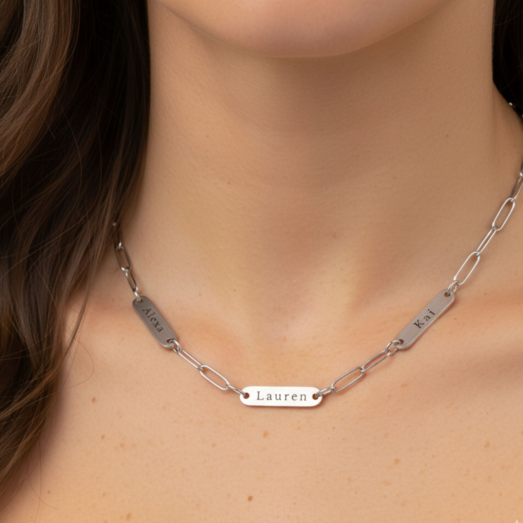 The Paperclip Chain Multi Name Necklace in Silver features a fine paperclip chain with up to three polished name bars, engraved to represent loved ones, dates or milestones.