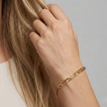 The Paperclip Bracelet in Gold features sleek elongated links for a refined, contemporary look that complements any outfit. Crafted from 18K gold plated stainless steel, it’s waterproof, tarnish-resistant and designed for everyday wear.