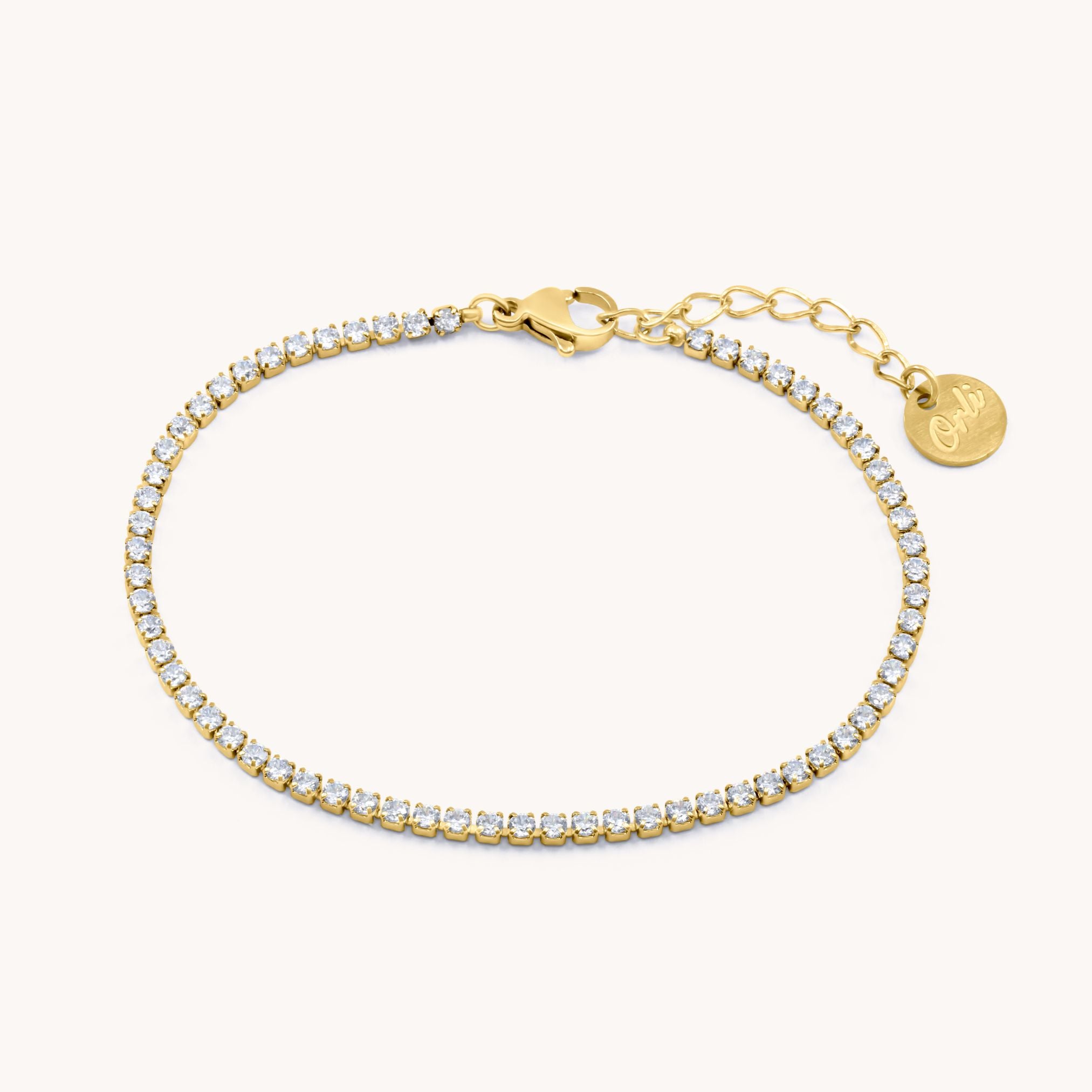 The Tennis Bracelet in Gold features a continuous row of sparkling cubic zirconia stones for a sophisticated, radiant finish. Crafted from 18K gold plated stainless steel, it’s waterproof, durable and designed to shine for every occasion.