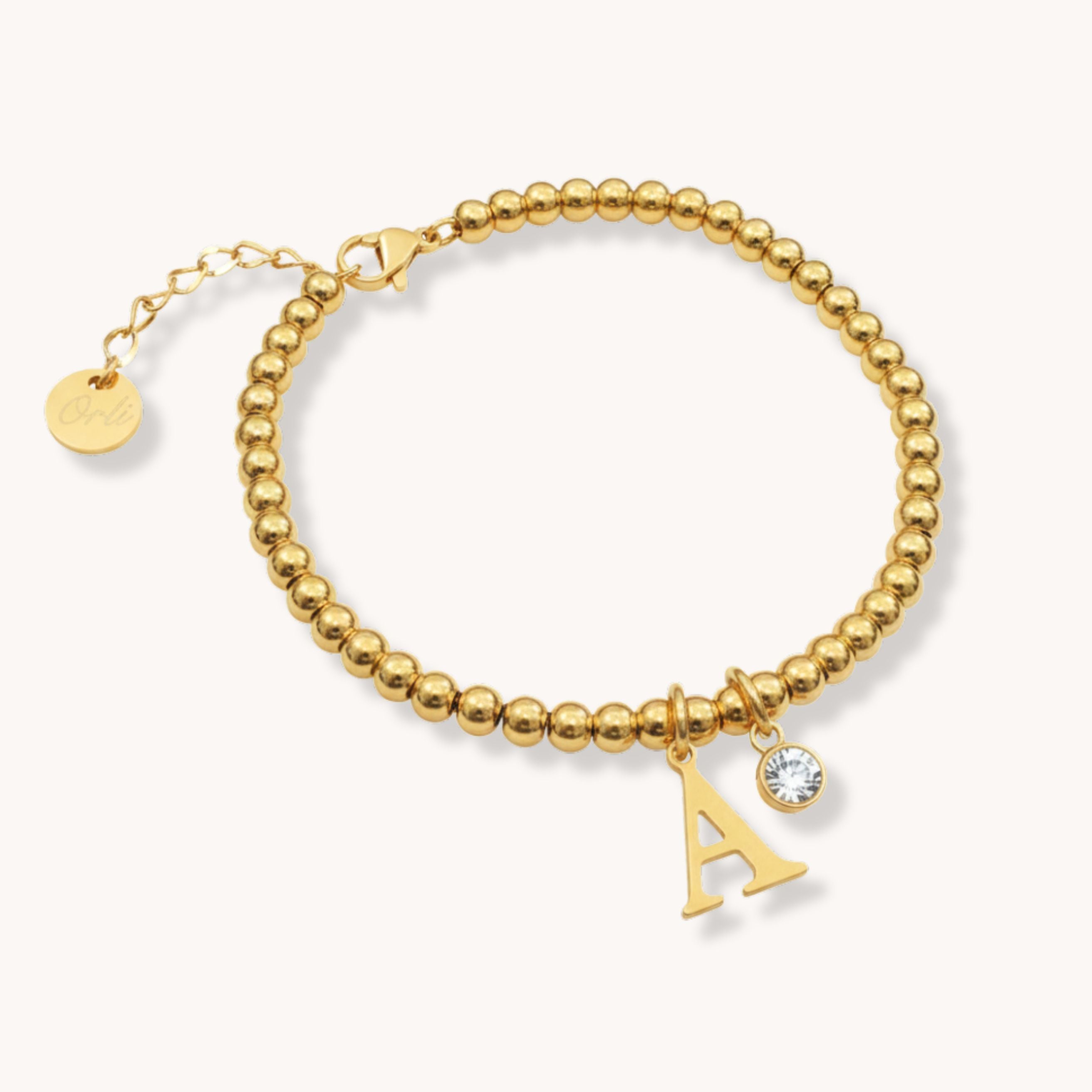A gold beaded initial bracelet that shines with sentiment — wear it solo for understated elegance or stack it with your favourites for a personalised look.