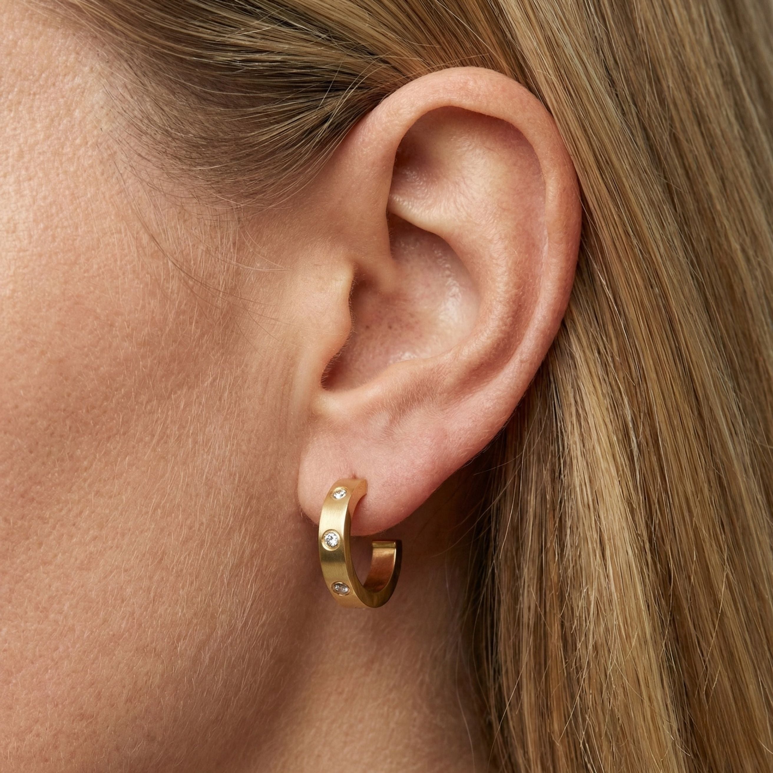 A gold crystal huggie earring style that blends clean lines with soft, wearable sparkle.