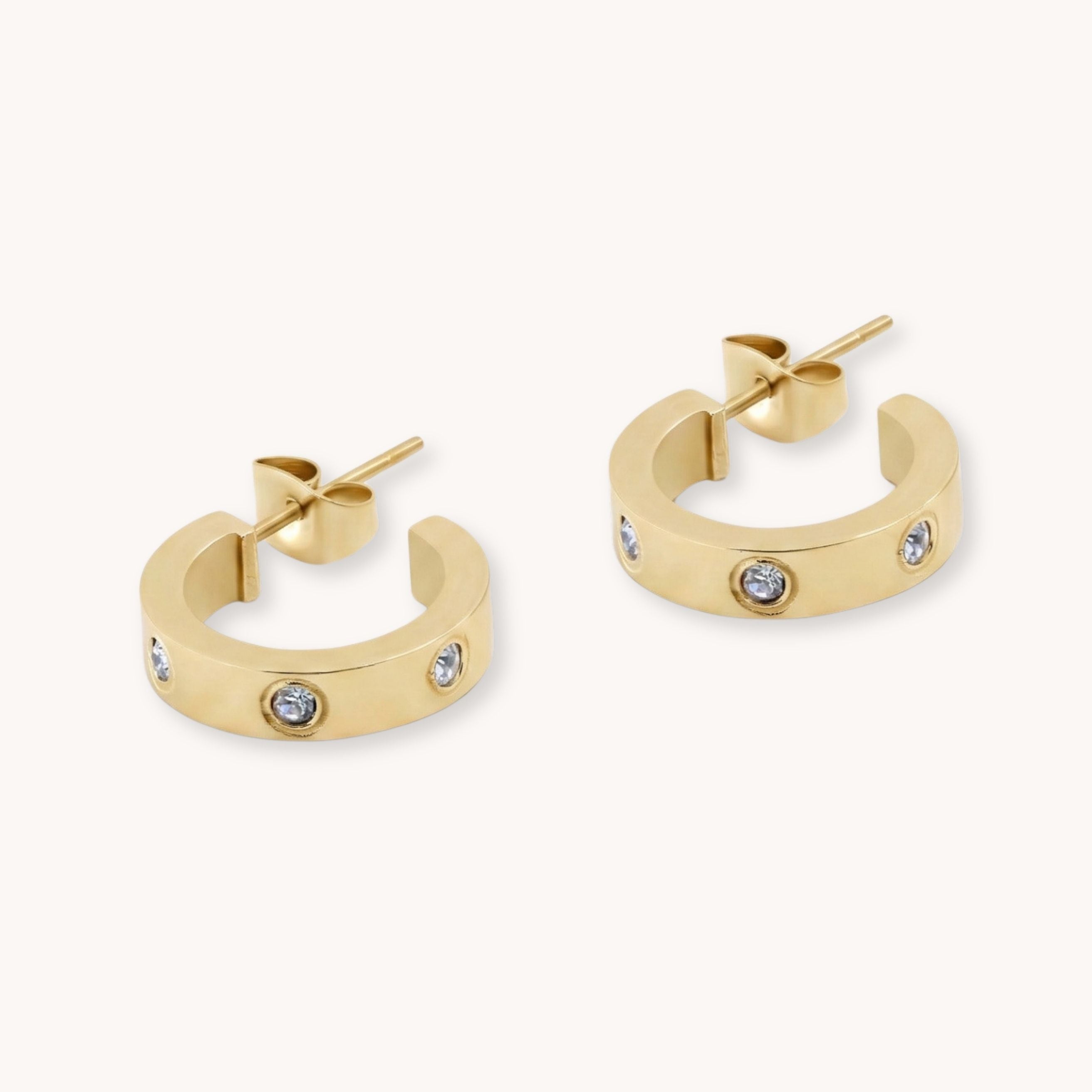 Design: Smooth chunky huggie hoops with bezel set round crystals spaced evenly around the front for subtle sparkle