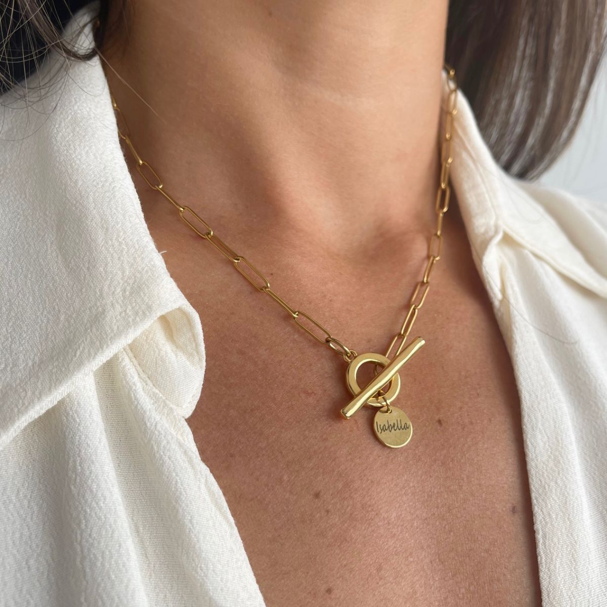 The Ella T-Bar Necklace in Gold is an everyday essential featuring a sleek paperclip chain, a trending T-bar clasp and a small engravable disc charm.