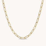 The Paperclip Chain Necklace in Gold features sleek, elongated links crafted from 18K gold plated stainless steel for a radiant, waterproof finish.