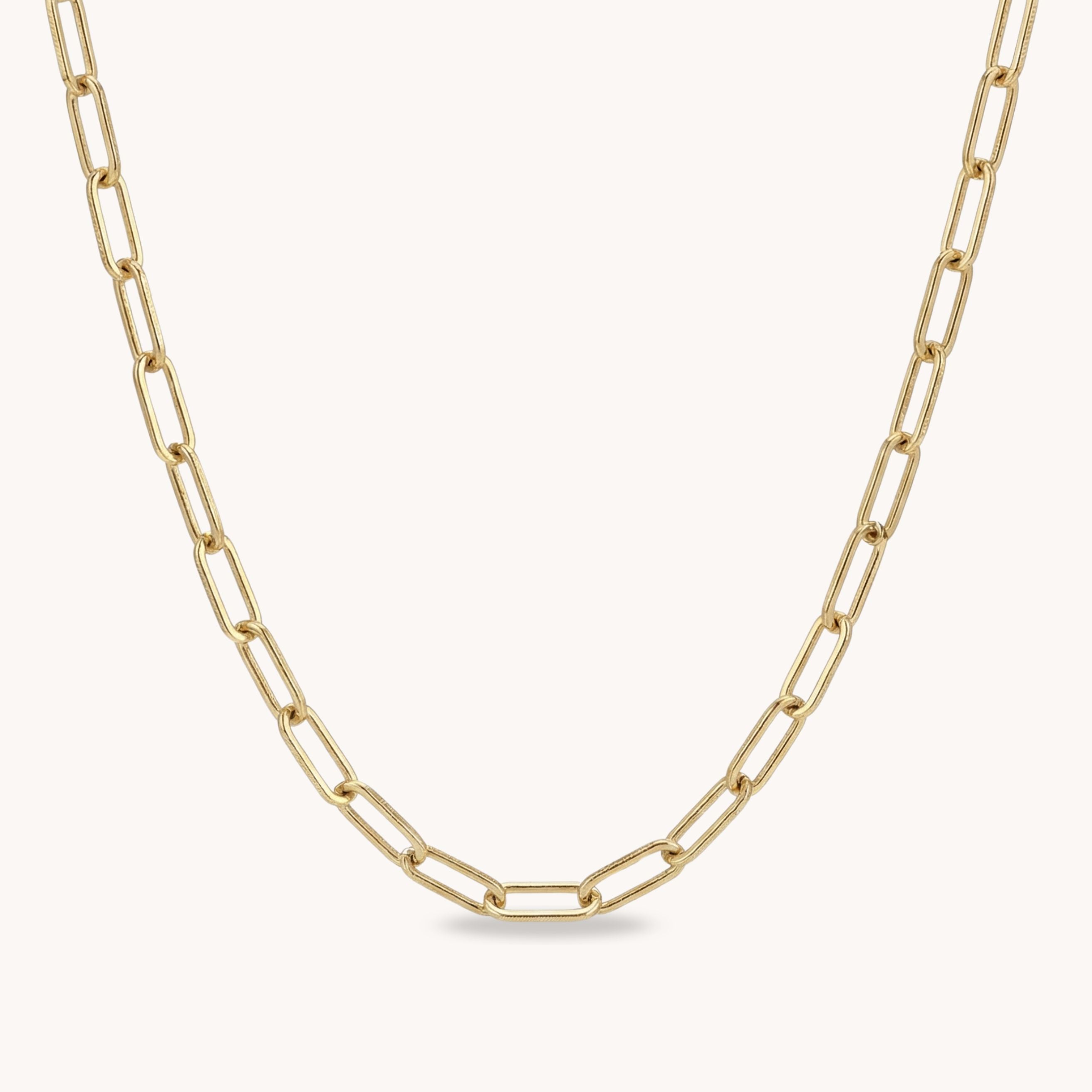 Design: Elongated paperclip chain with smooth polished finish
