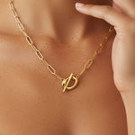 The Twisted T-Bar Necklace in Gold features an elegant paperclip chain and a sleek twisted toggle clasp, blending classic design with contemporary edge.