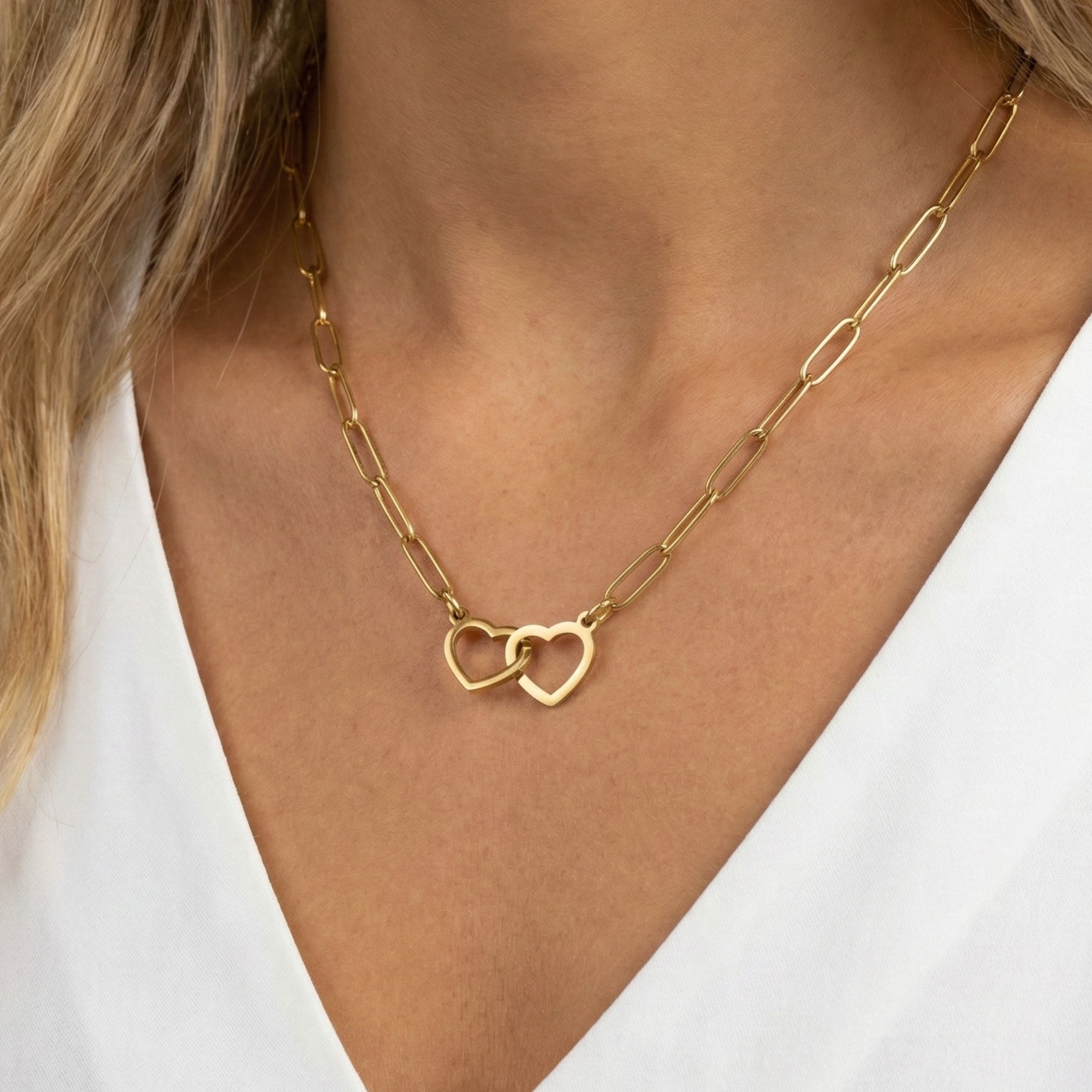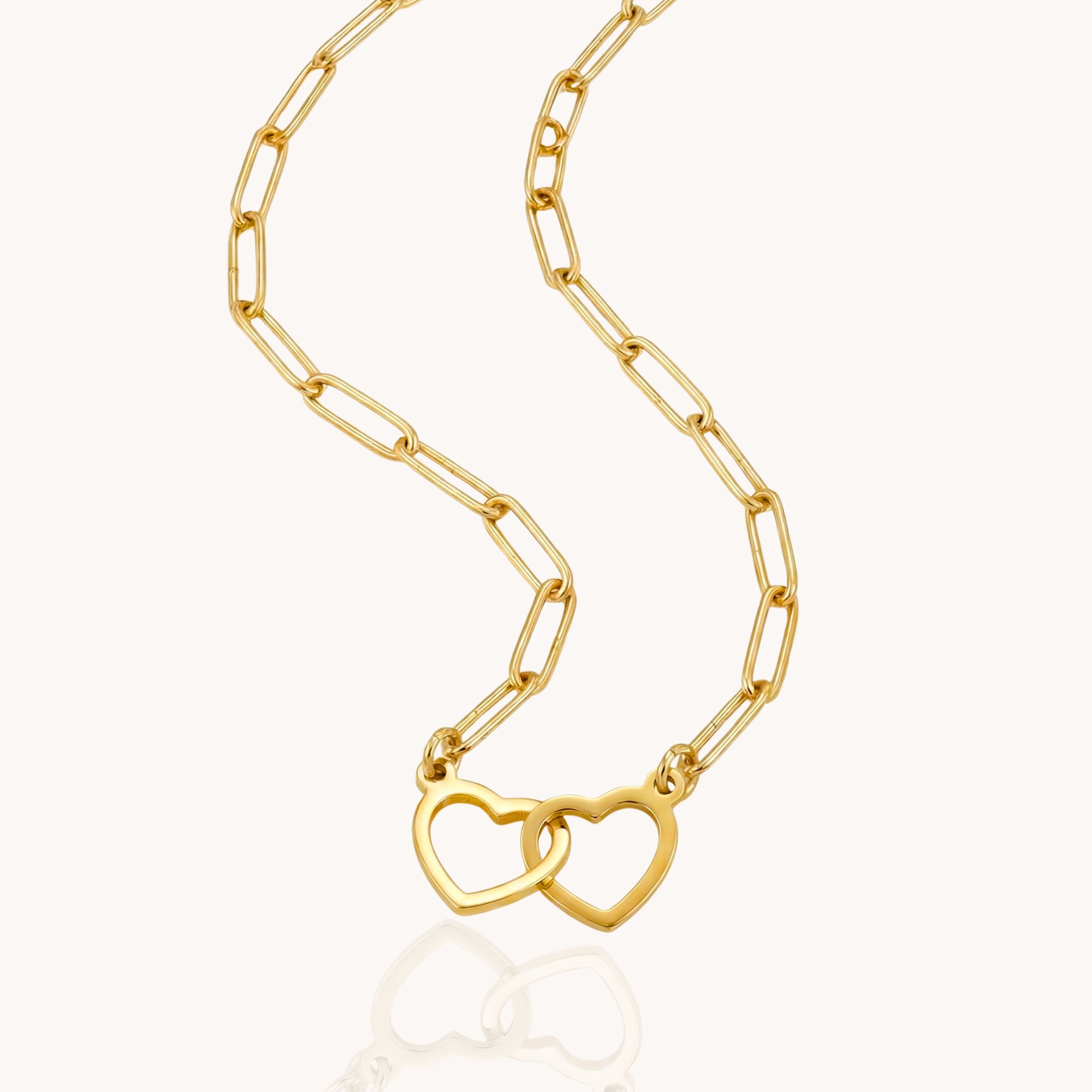 The Interlinked Heart Paperclip Necklace in Gold features a modern paperclip chain finished with two intertwined hearts — a beautiful symbol of love, connection and strength.