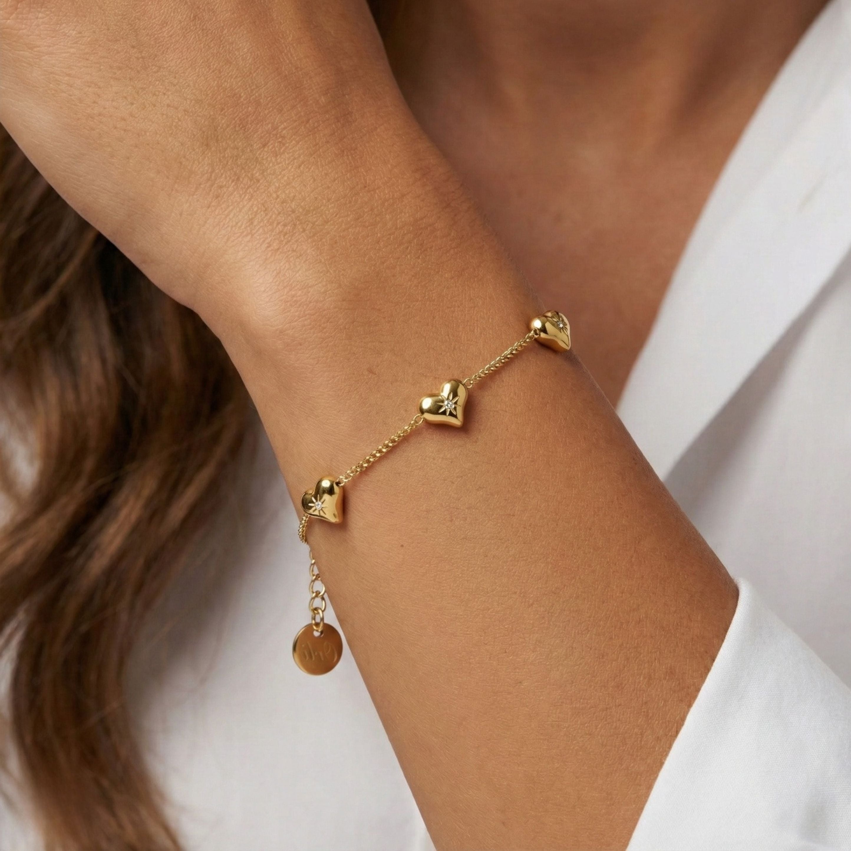 The Crystal Starburst Multi Heart Bracelet in Gold features a series of polished heart charms adorned with dazzling crystal starburst accents — adding a touch of luxury and light to any look. Crafted from 18K gold plated stainless steel, it’s waterproof, durable and designed for everyday elegance.