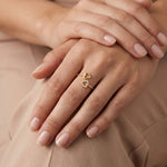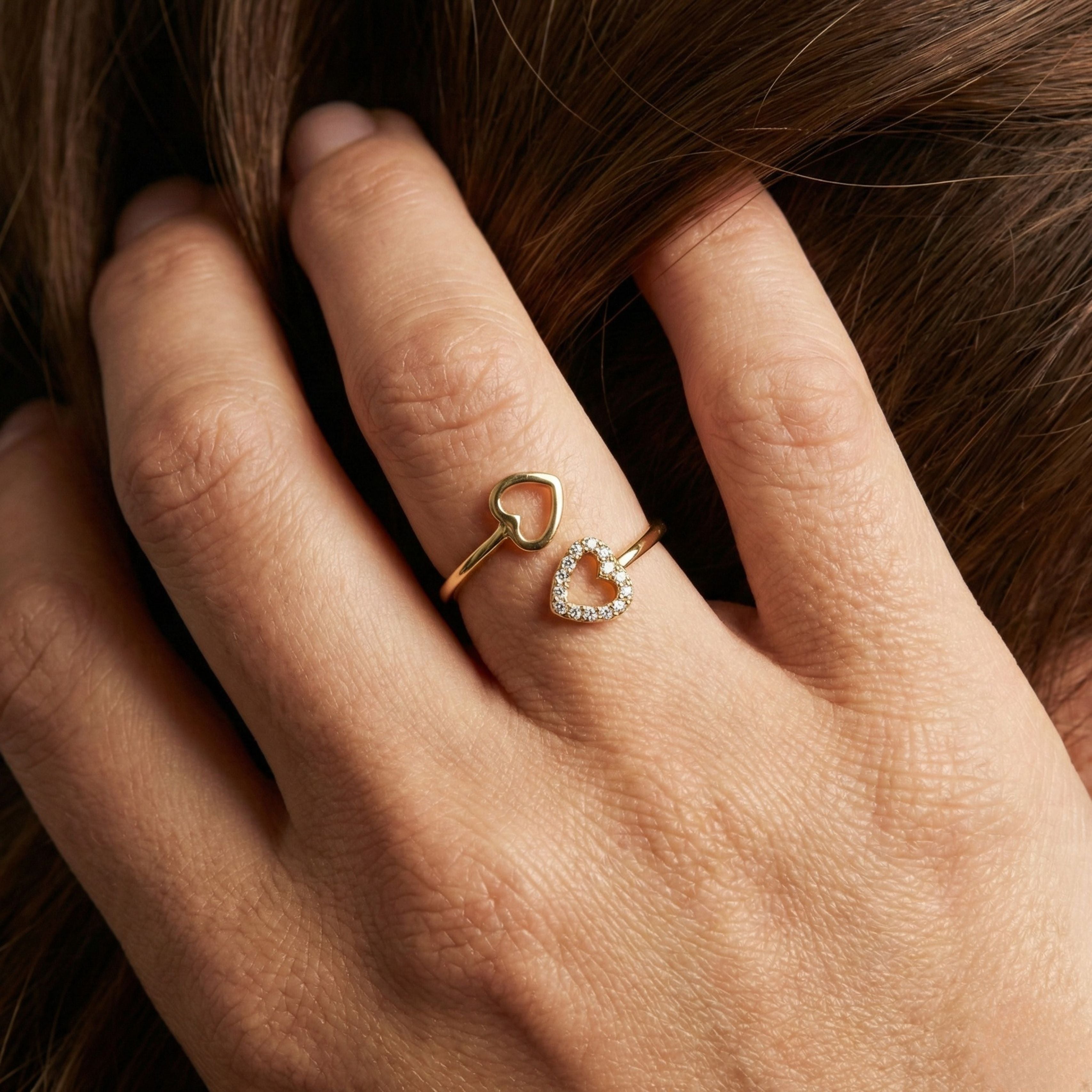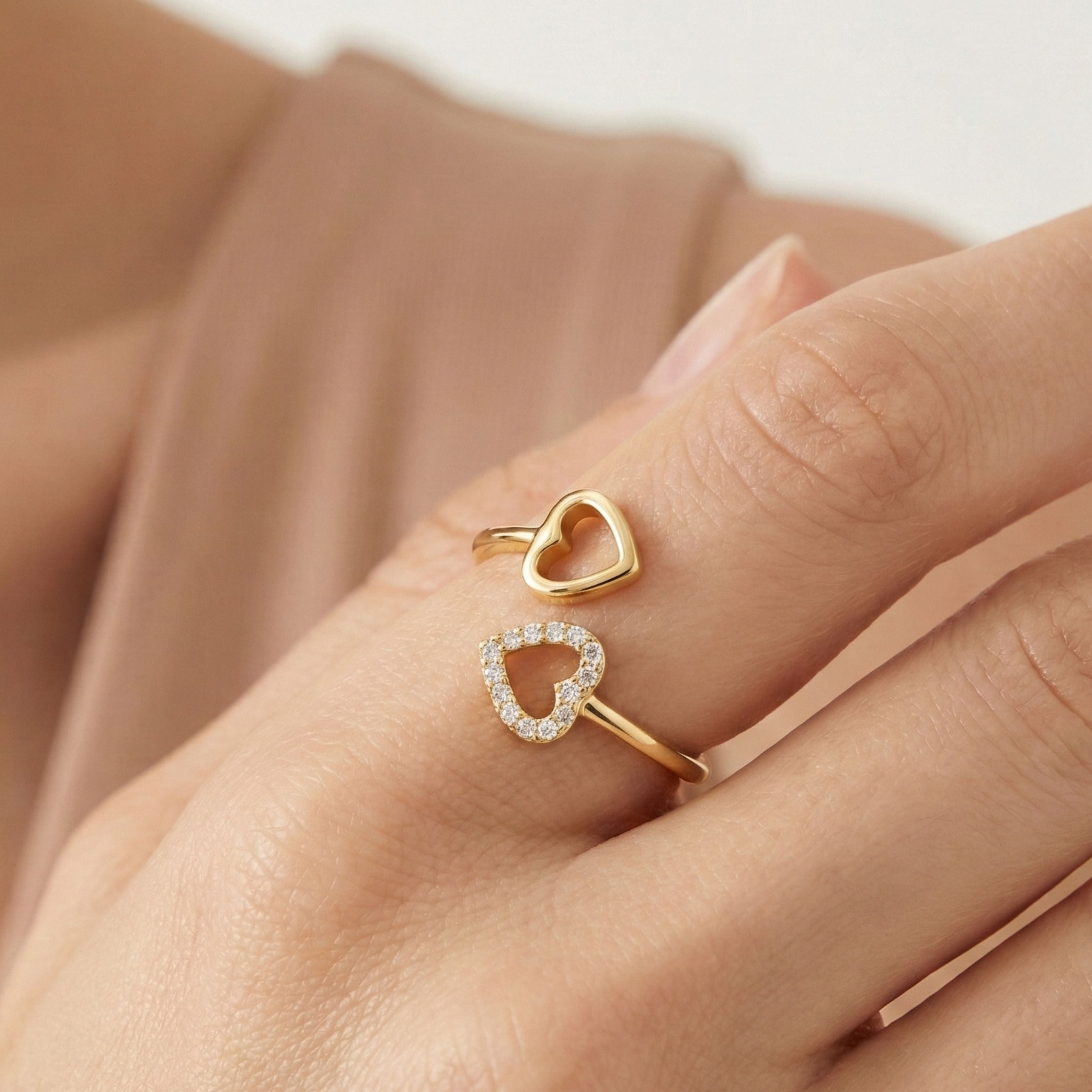 Romantic and radiant, the Halo Heart Ring features two golden hearts – one sleek and minimal, the other surrounded by a sparkling halo of stones. A modern symbol of love, perfect for stacking or gifting.