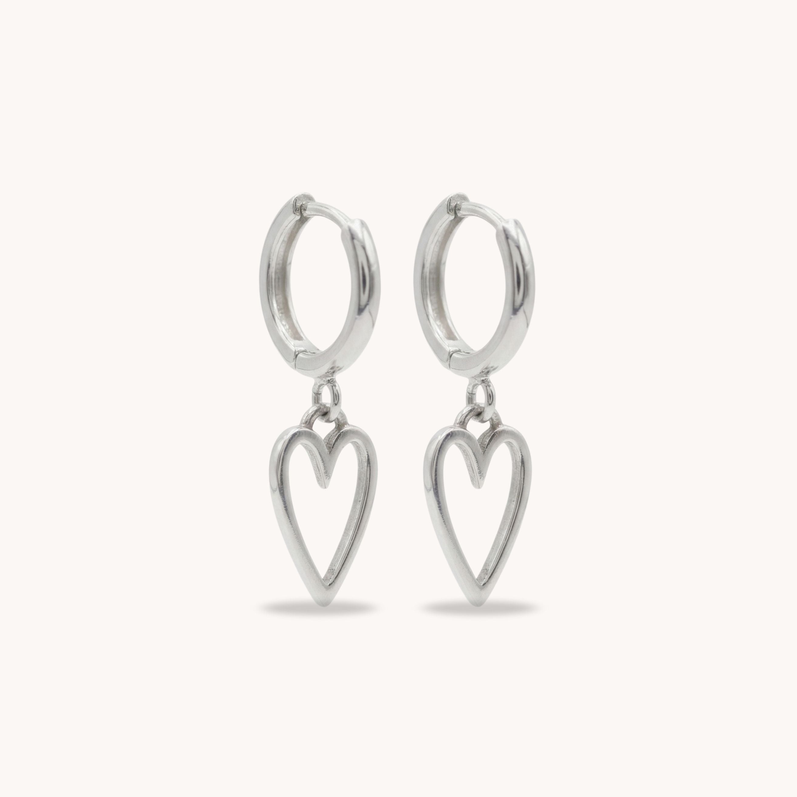 Design: 14mm smooth silver huggie hoops with a delicate open heart charm that hangs freely for subtle movement