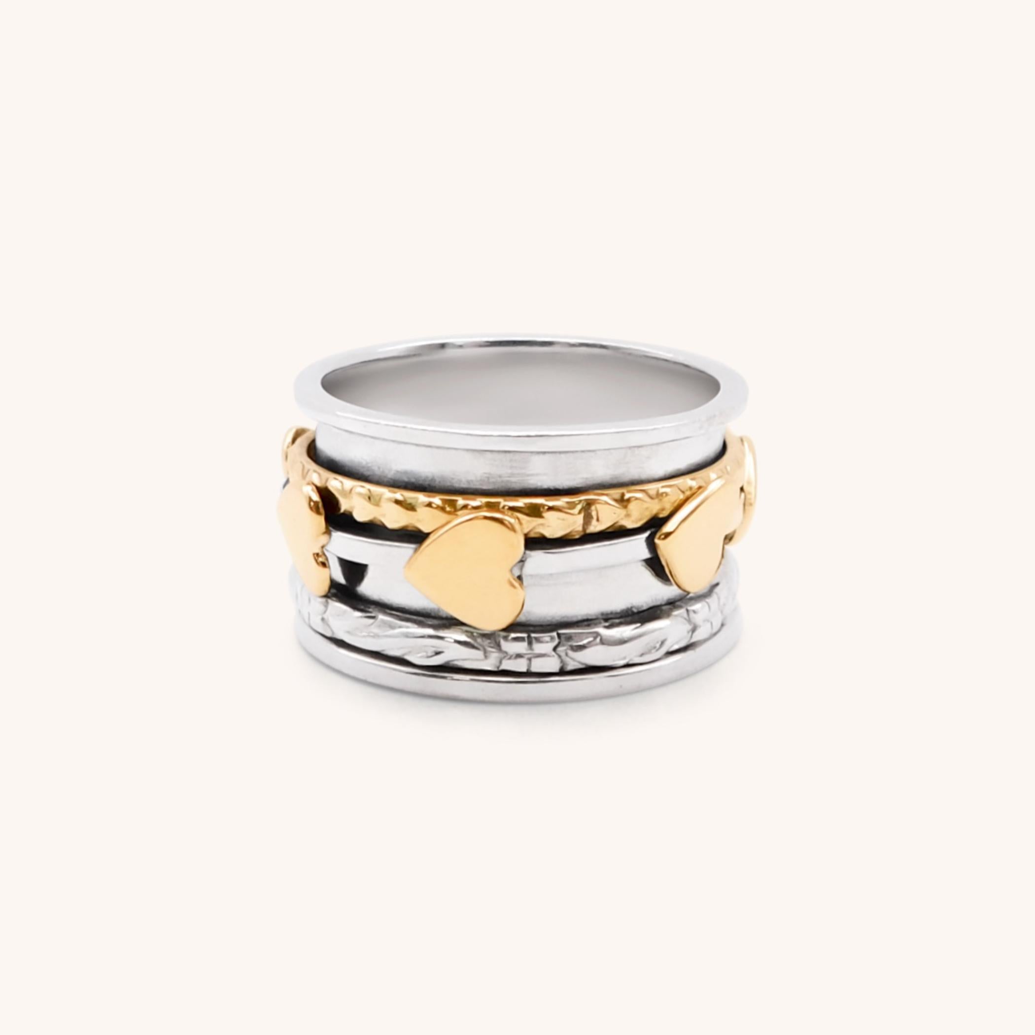 Sterling silver 925 spinner ring.  This stunning ring has a thick smooth band with a burnished background featuring 1 yellow gold heart band and 1 yellow gold twisted band.