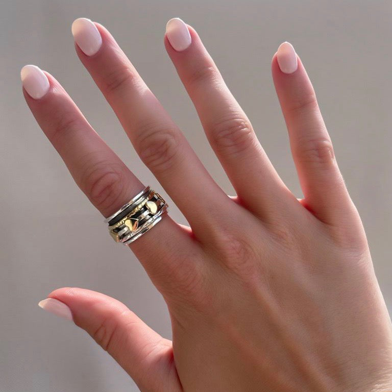 The spinner ring comes from an ancient Tibetan meditation tradition, and is also called a "worry ring" because the motion of spinning the ring is believed to have a calming effect on the mind and body.