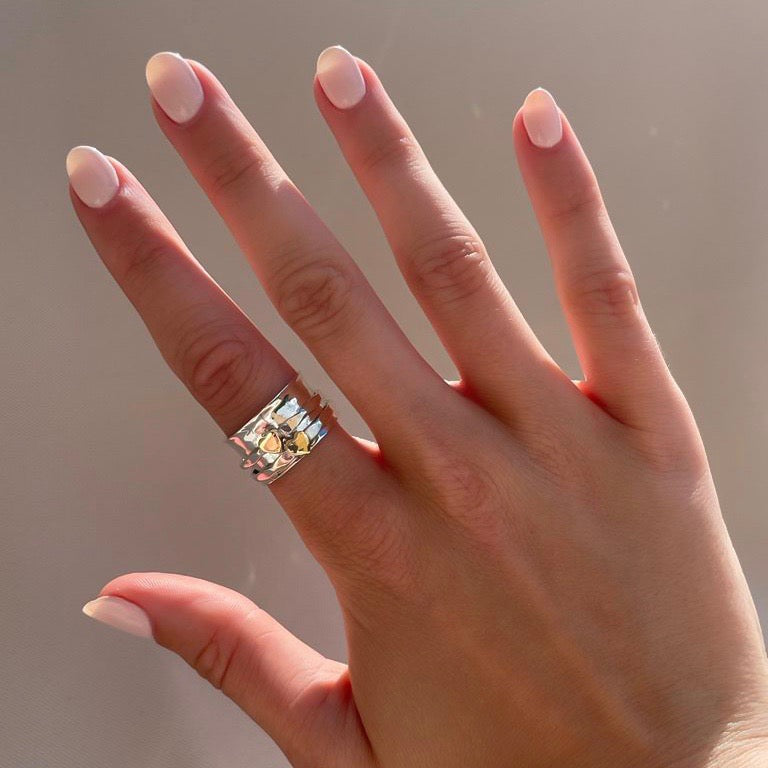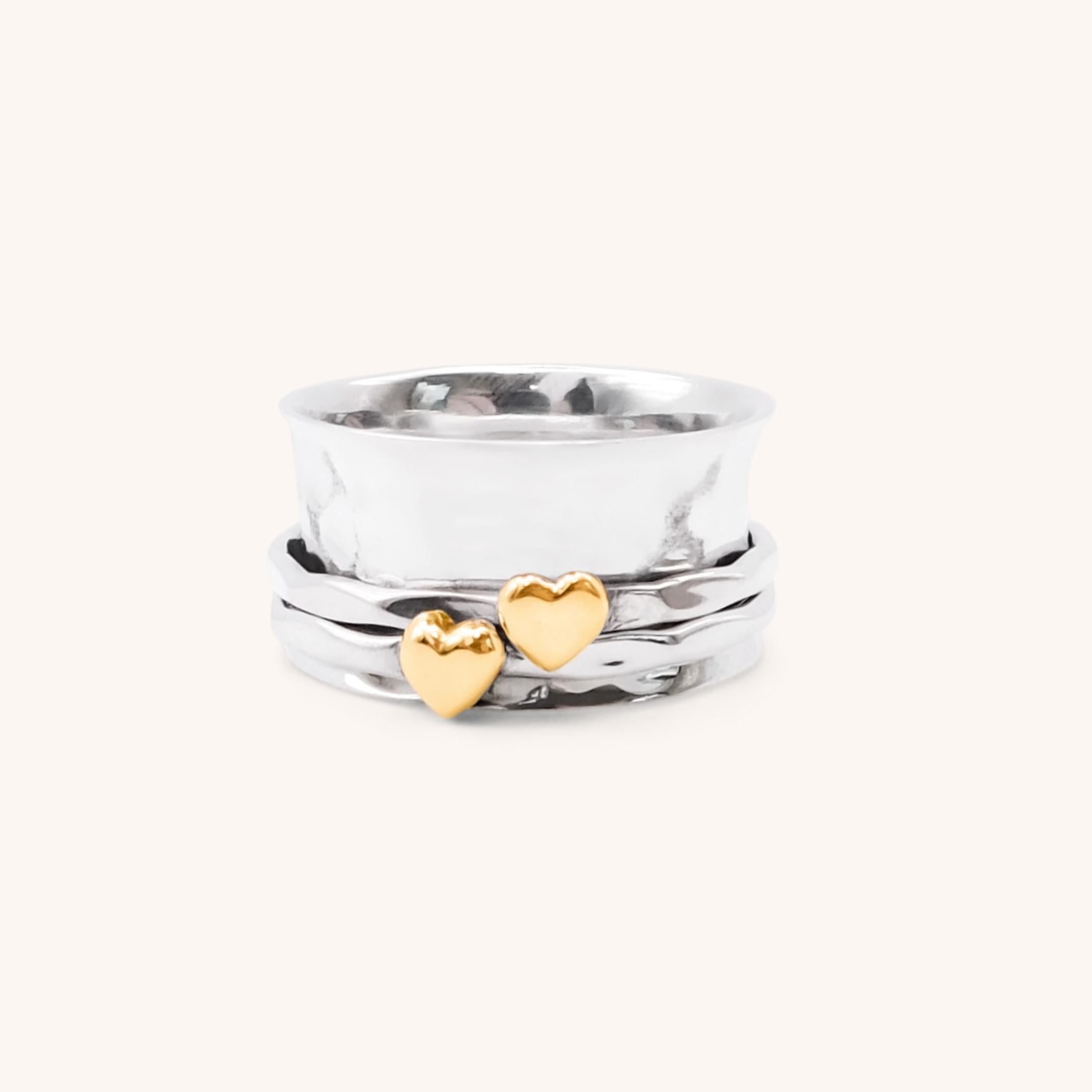 Sterling silver 925 spinner ring.  This stunning ring has a thick hammered band, with two silver rings featuring 2 yellow gold hearts.