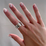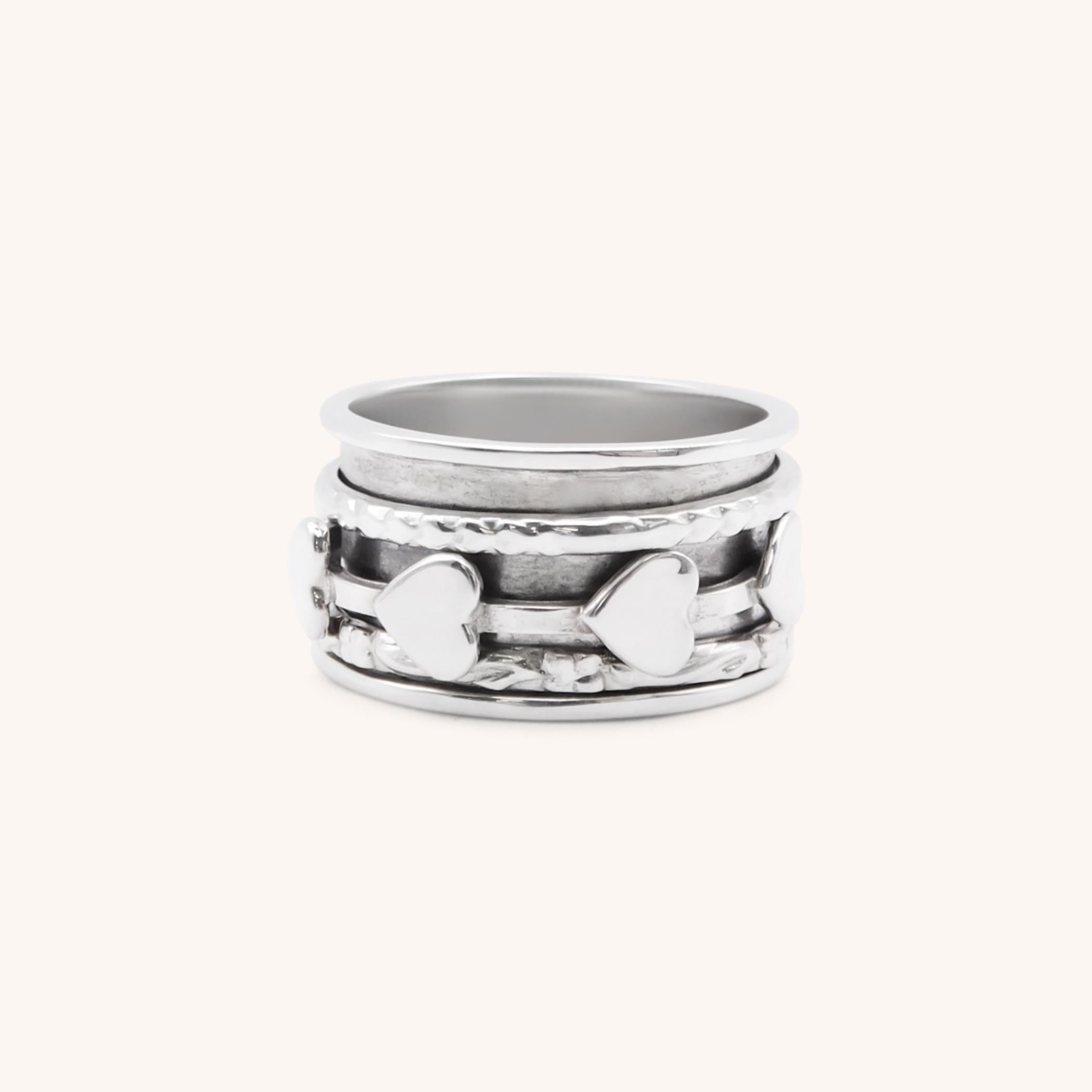 Sterling silver 925 spinner ring.  This stunning ring has a thick smooth band with a burnished background featuring 1 heart band and 1 twisted band.