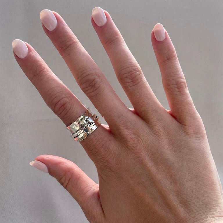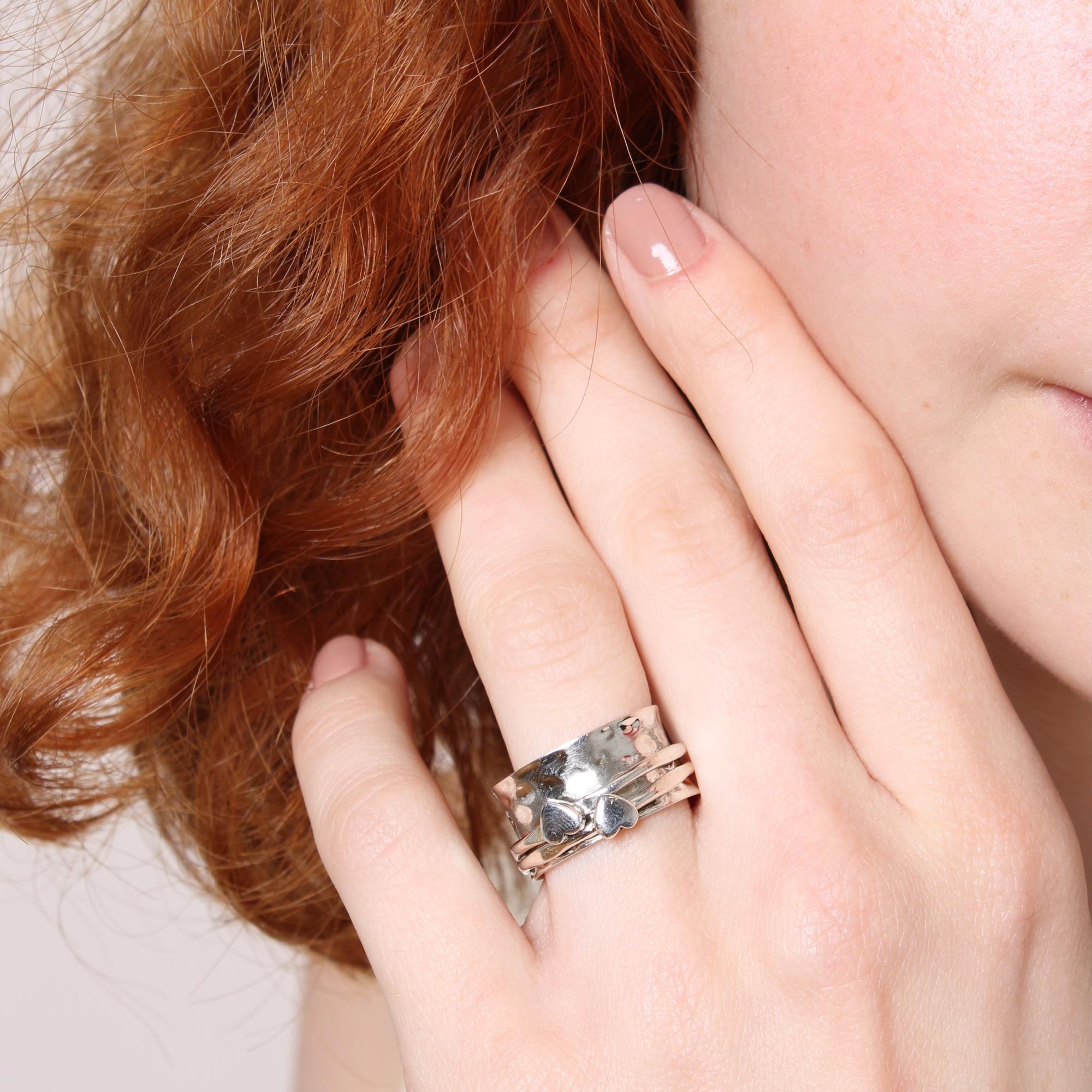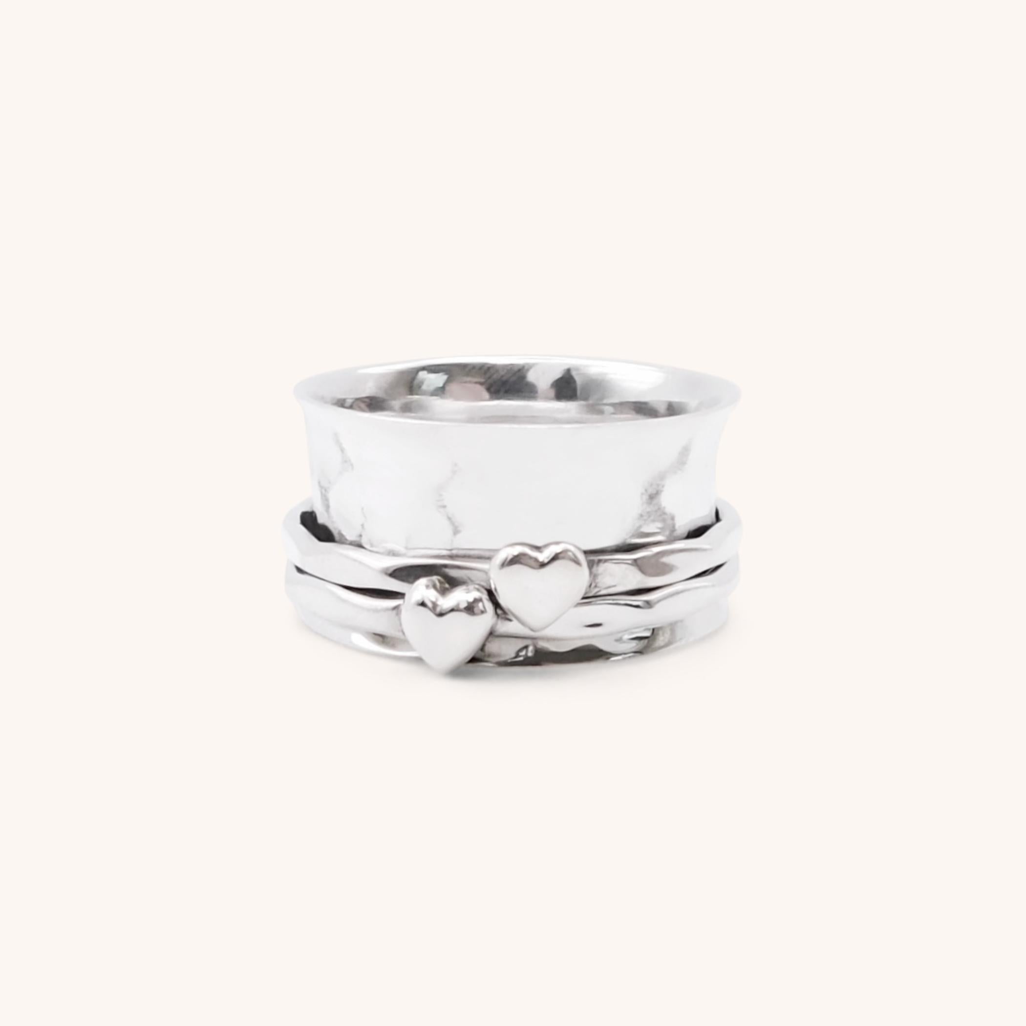 Sterling silver 925 spinner ring.  This stunning ring has a hammered band, with two silver rings featuring two silver hearts
