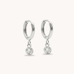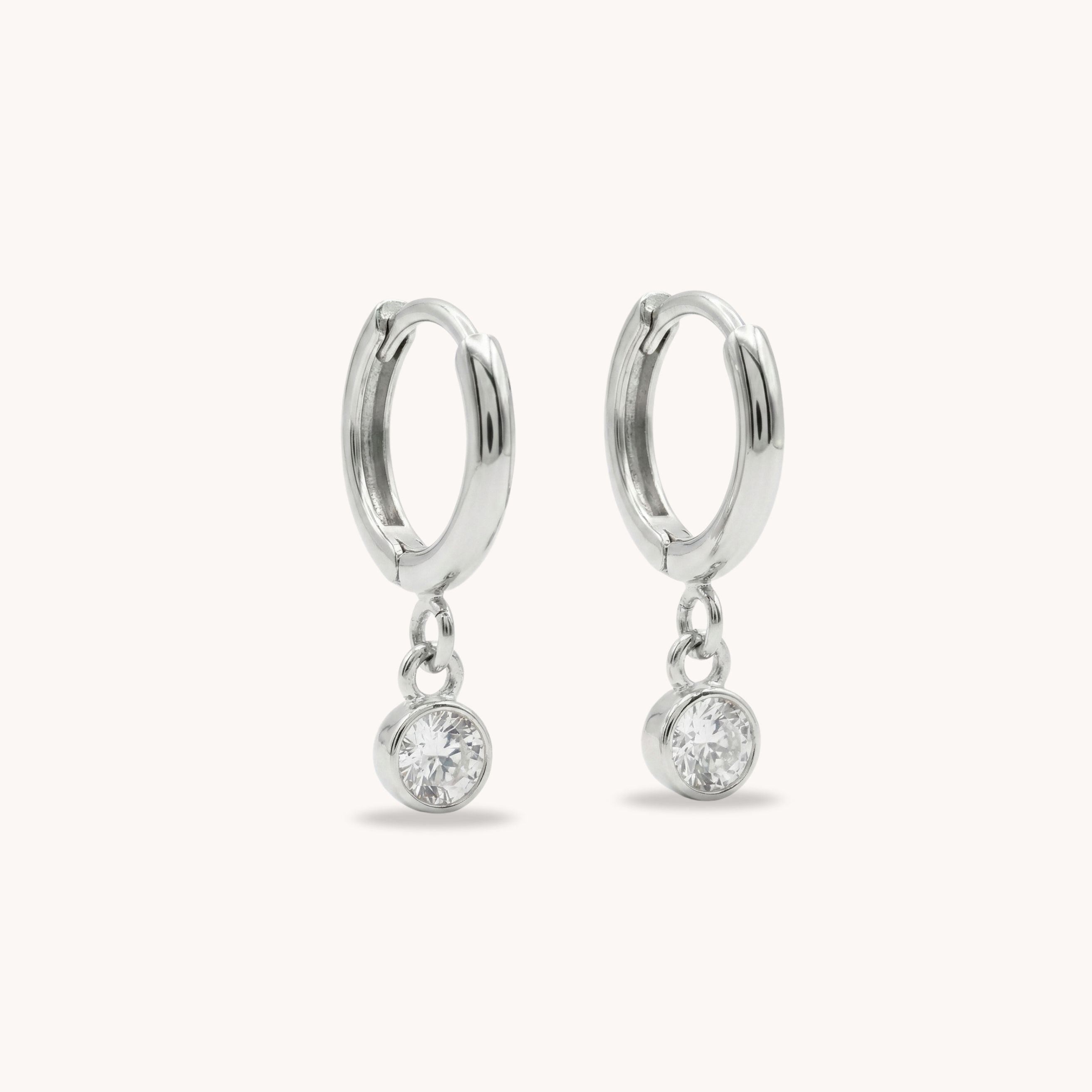 Design: 14mm smooth silver huggie hoops with a bezel set round birthstone charm that gently dangles for subtle movement and shine