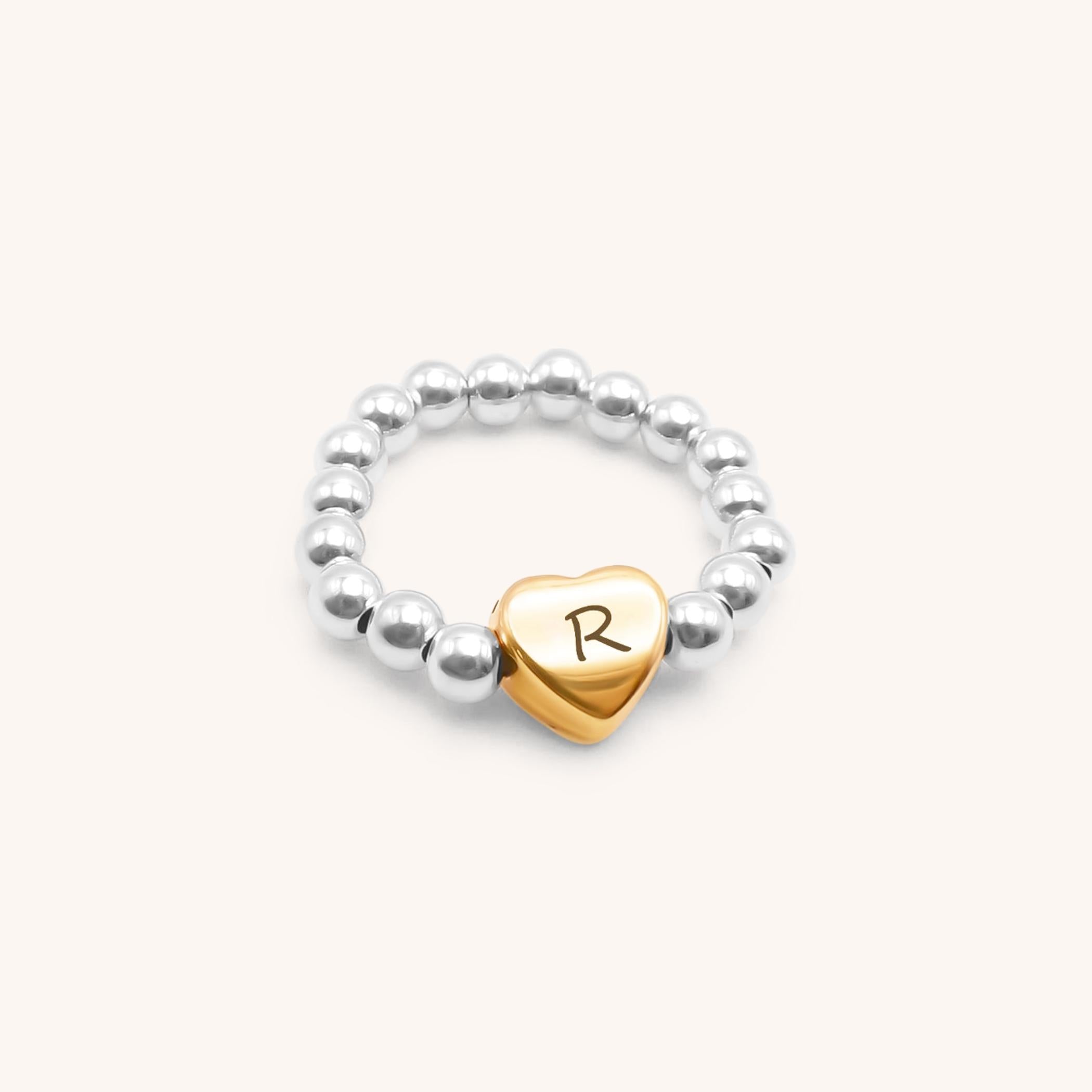 Radiating elegance, this beaded ring features a gold-plated heart charm, engraved with an initial of your choice for a meaningful touch. The rich gold-tone heart adds warmth and charm, making this a standout addition to any jewellery collection.
