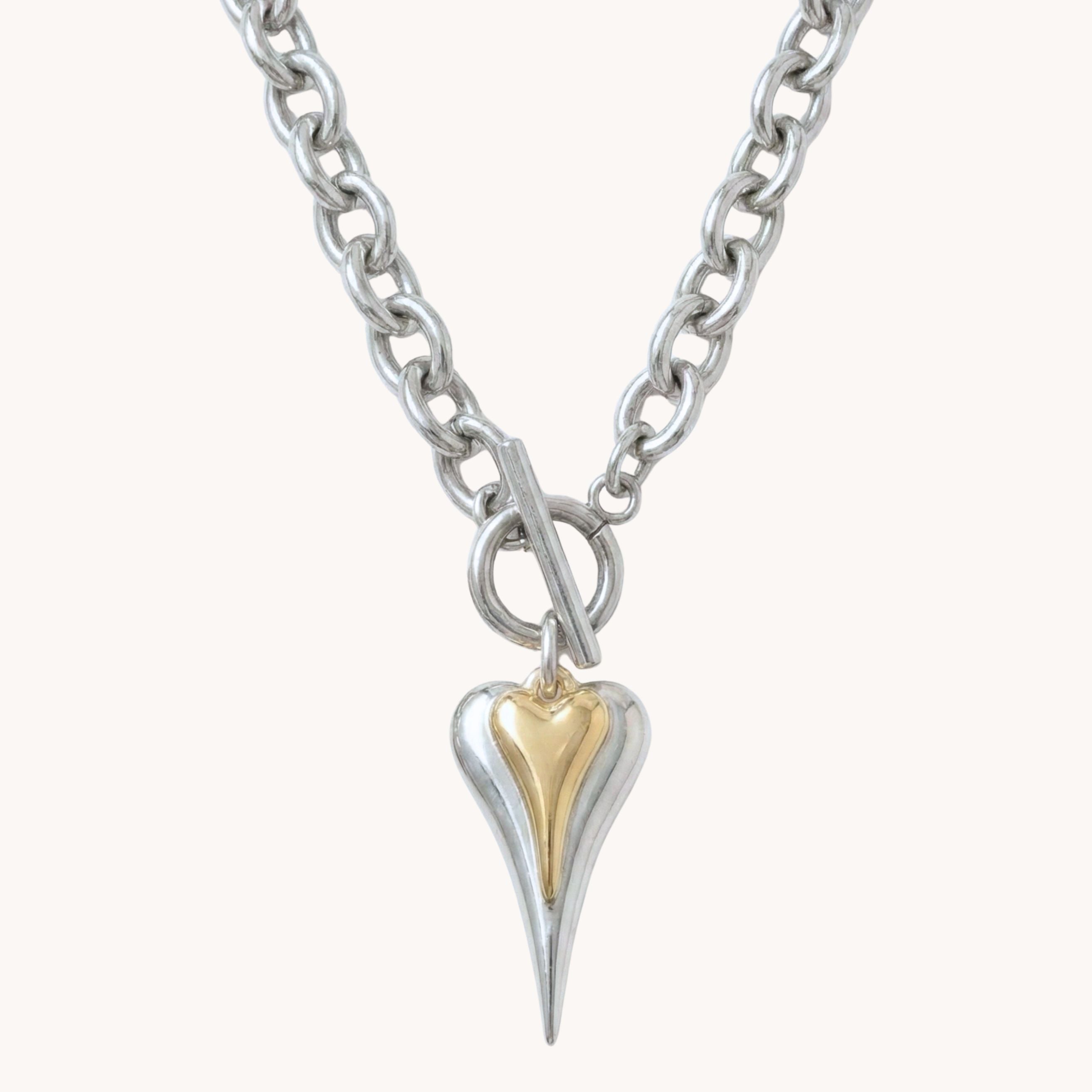 A mixed-metal heart necklace that’s sculptural, symbolic and made to stand out — perfect for gifting or adding statement edge to any look.
