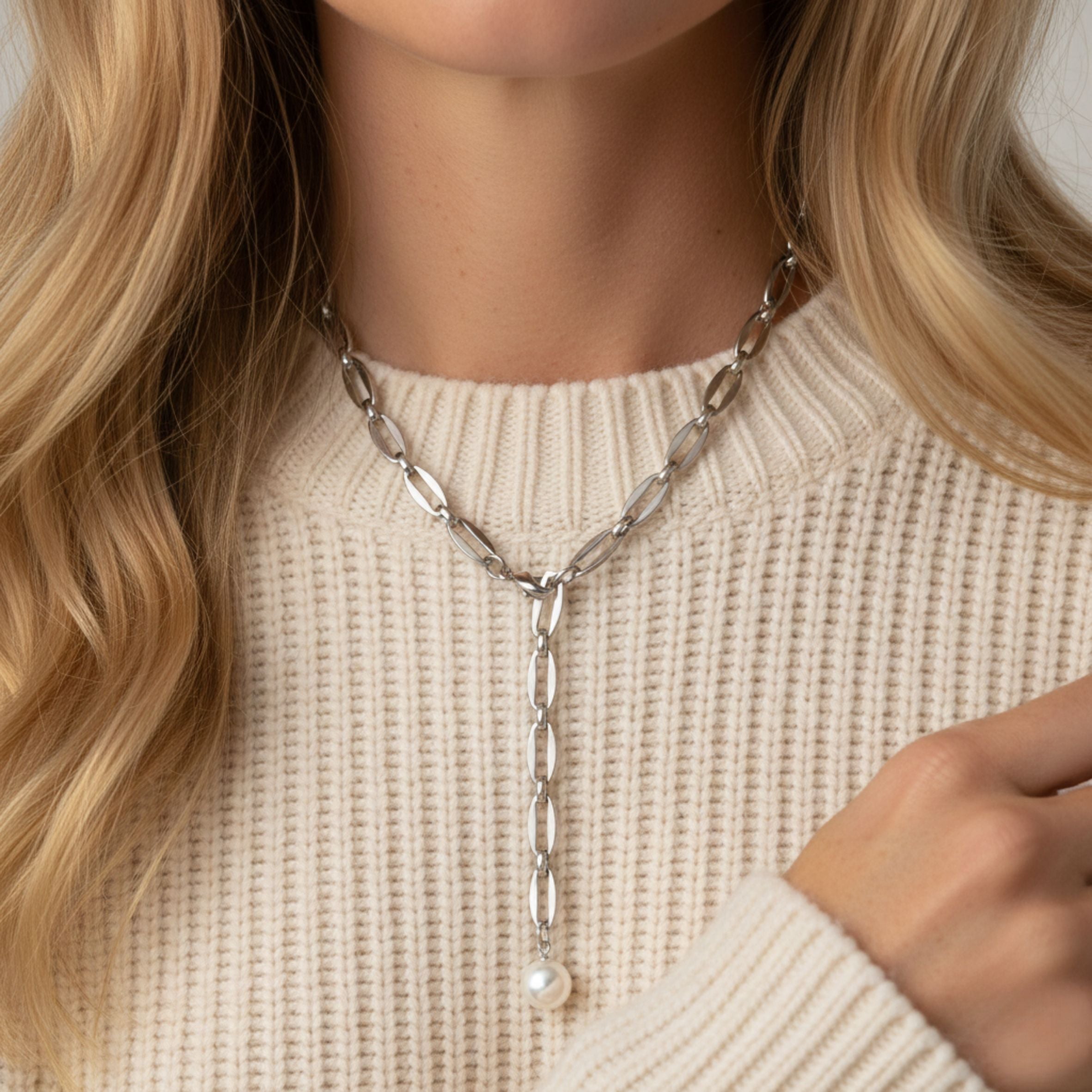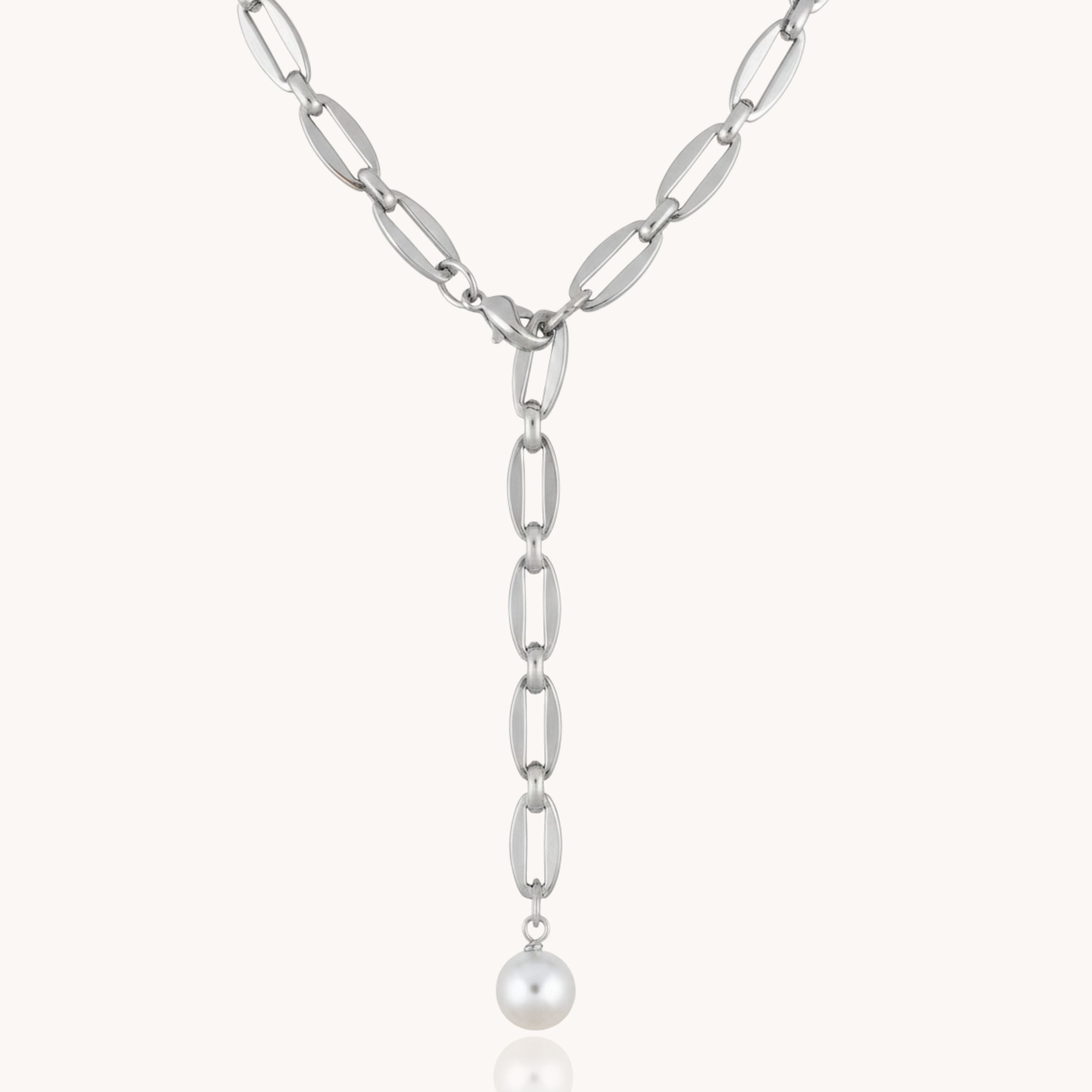 A silver pearl long-link necklace that blends edge and elegance — a statement piece made to elevate every look.