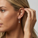 Give your ear stack a cosmic touch. These stunning Sterling Silver huggie hoops feature a starburst charm, adding sparkle to your stack. The crystal paved 8 point star is like no other. They hug close to your lobe, making them perfect for any piercing. They can be stacked with other earrings or worn alone for a statement look.