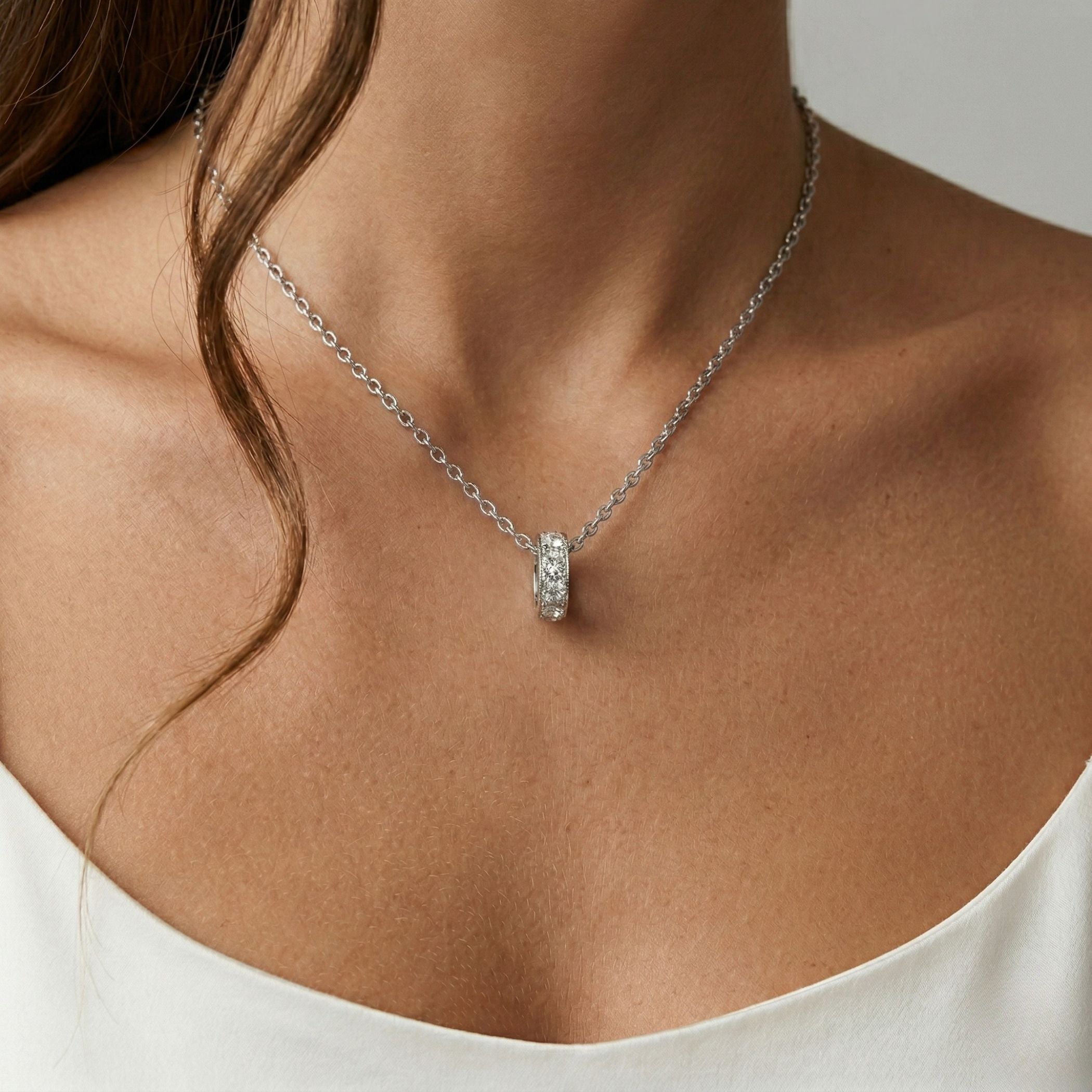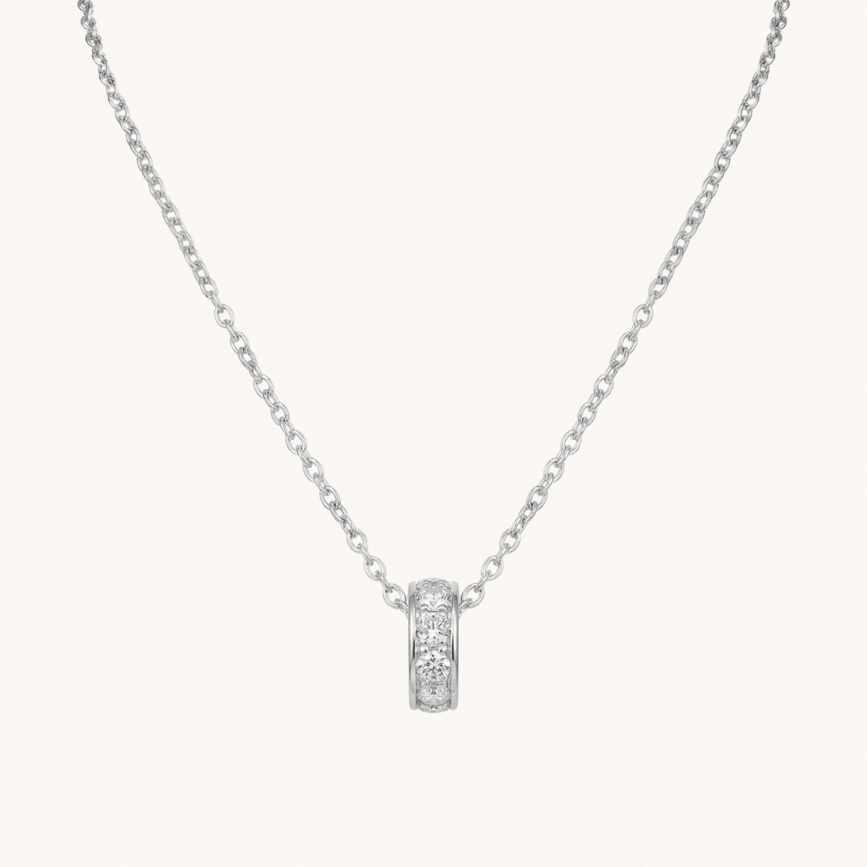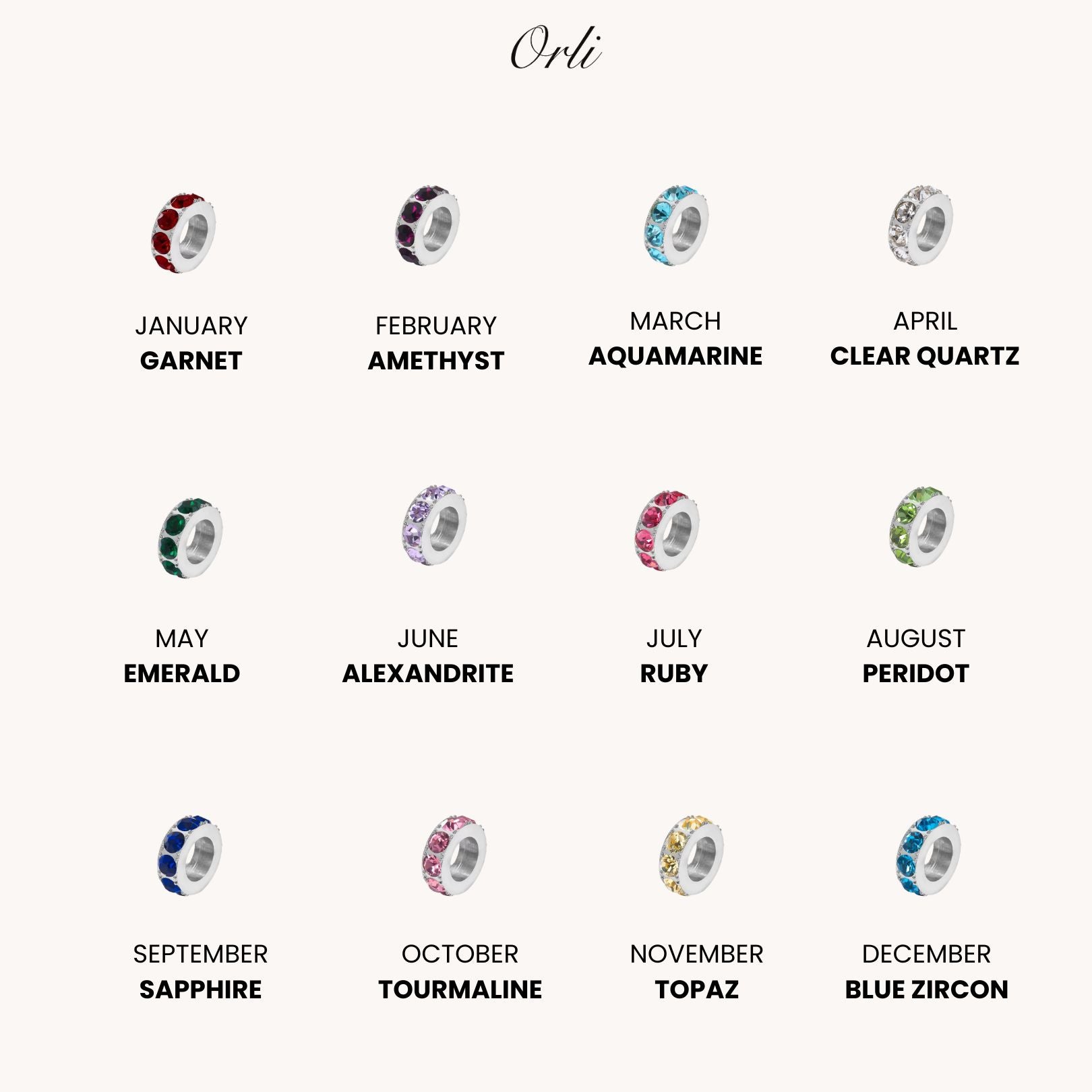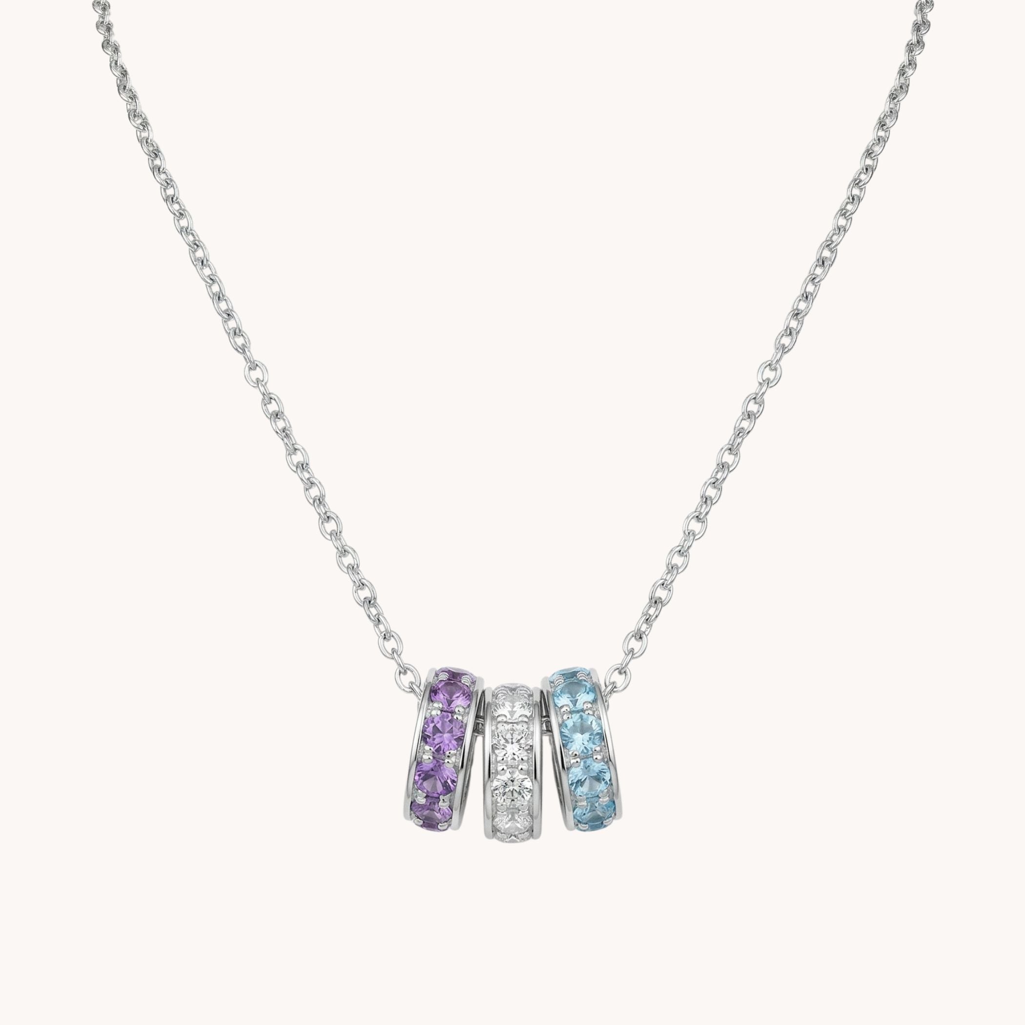 Design: Polished silver ring pendants set with sparkling birthstones that glide smoothly along a delicate silver chain, creating a timeless and elegant layered look