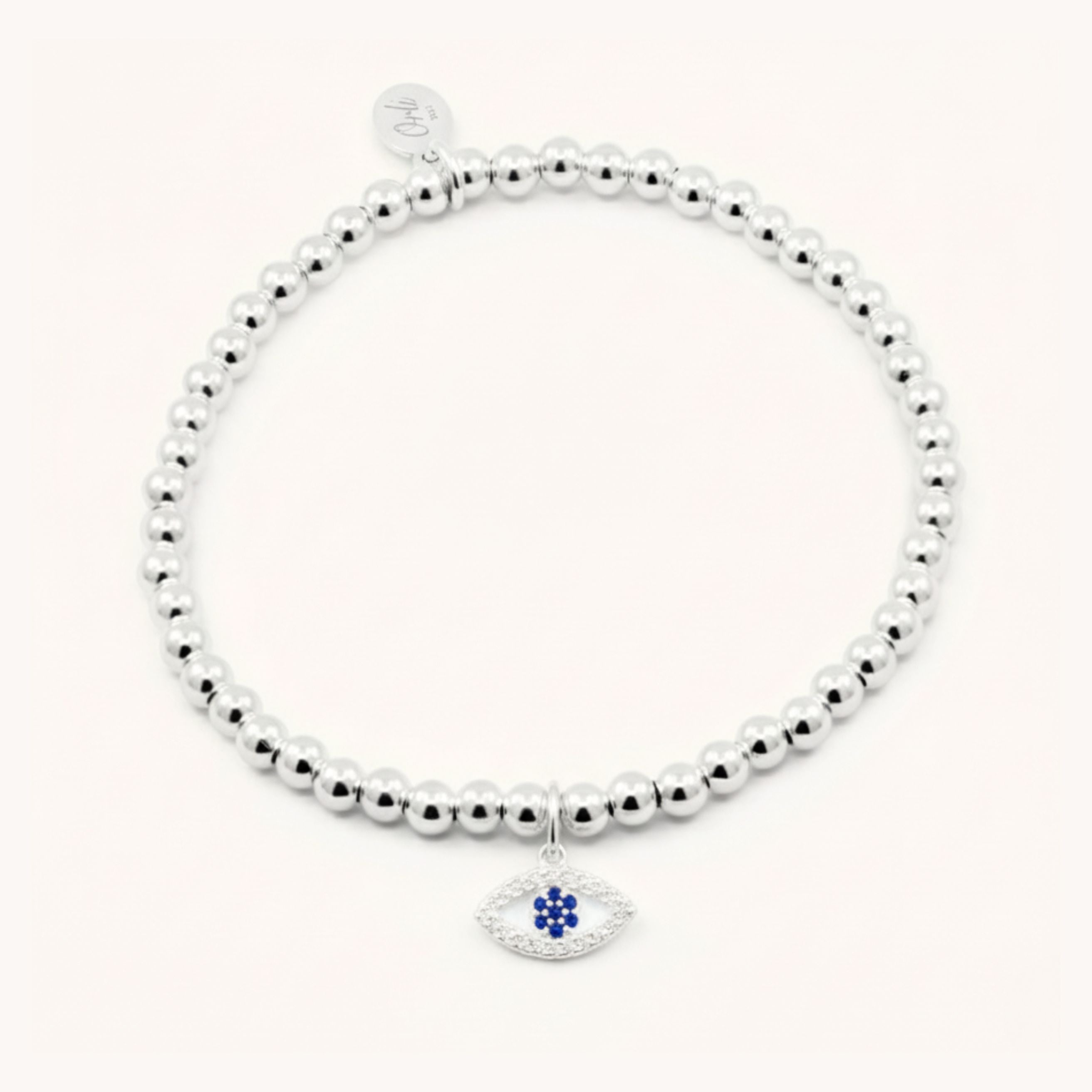 A timeless sterling silver evil eye bracelet that combines symbolism and shine — perfect for everyday wear or gifting.