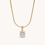 Design: Round brilliant-cut solitaire stone in a four-prong setting with a pavé set bail, suspended on a smooth snake chain for a sleek, modern finish