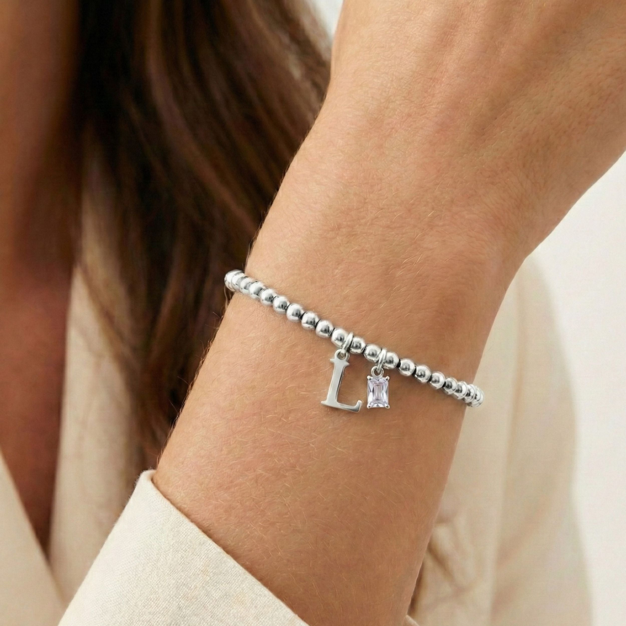A silver beaded initial bracelet that shines with sentiment — wear it solo for understated elegance or stack it with your favourites for a personalised look.