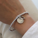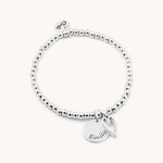 Made to celebrate the people who mean the most, this personalised bracelet is full of sentiment and style. Featuring polished silver-plated beads, an open heart charm, and a custom-engraved disc—this piece is a beautiful way to keep names, words, or memories close.
