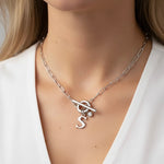 The Gracie Initial & Birthstone T-Bar Necklace in Silver features a sleek paperclip chain with a personalised initial charm and sparkling birthstone, finished with a modern T-bar clasp.